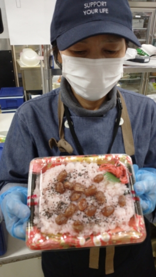 おはようございます。お惣菜コーナーではお赤飯を販売中。豆には甘納豆をたっぷり使用したふっくら美味しいお赤飯です。ほんのり甘くて美味しいお赤飯、是非ご利用ください