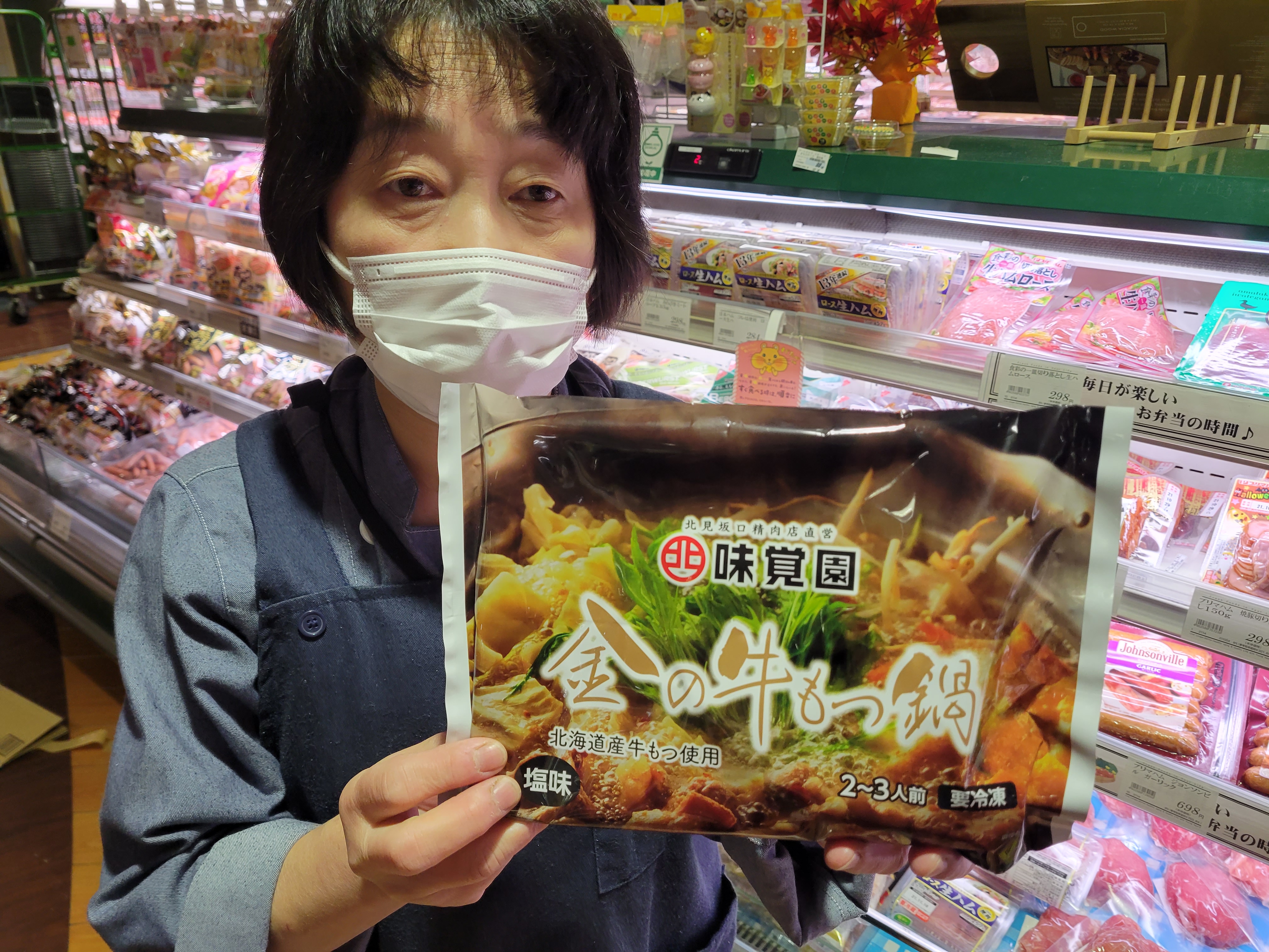 本日ミート担当、平間さんのイチオシ味覚園、金の牛もつ鍋がおすすめです🎵北海道産牛もつを贅沢に使いました。通常価格698円の商品を本日限定で399円にて販売中今一番売れてる鍋商品ですご利用下さいね😄