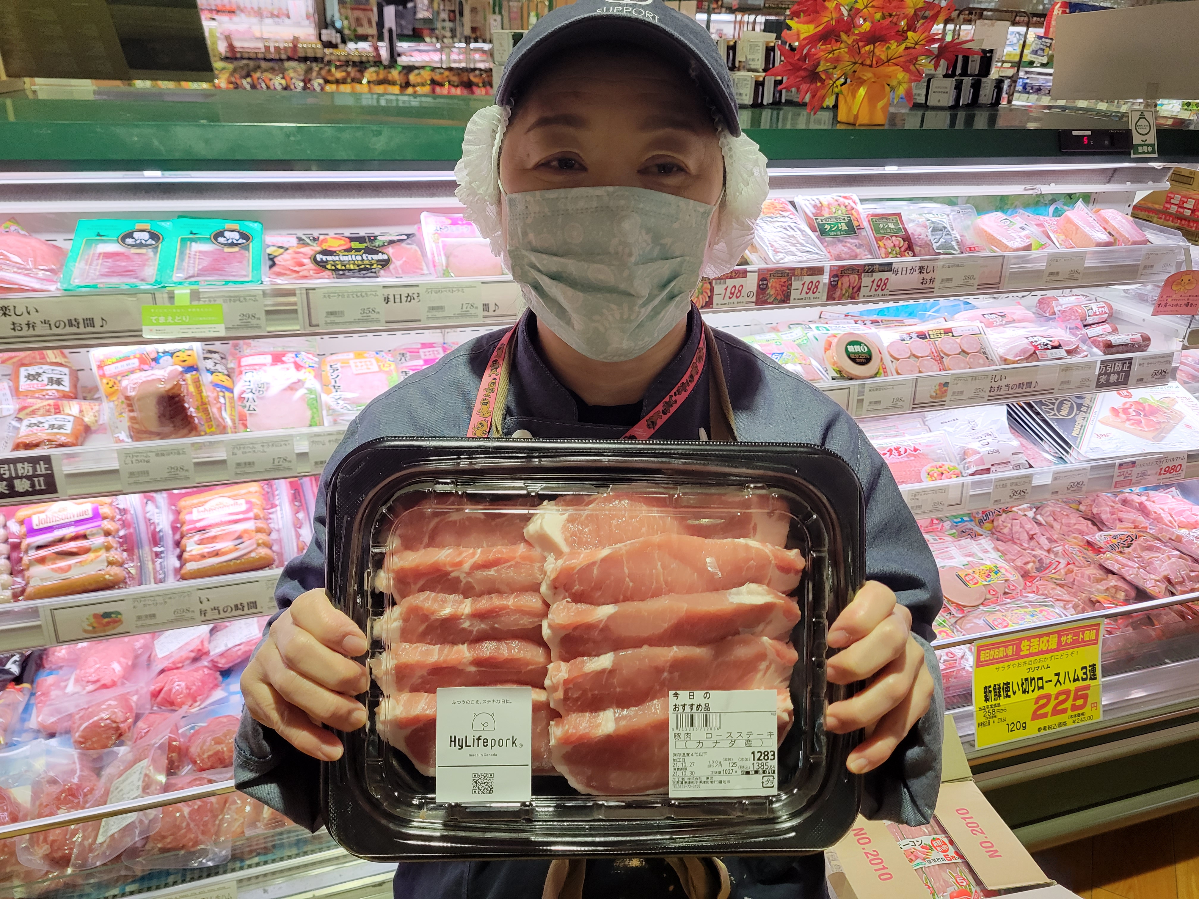 本日ミート担当、宮崎さんのイチオシカナダ産ハイライフポークがおすすめです🎵臭みが少なく、脂身の甘みが特徴のお肉です。ふつうの日をすてきな日にハイライフポークを使ってトンテキはいかがですか🎵100g当たり125円にて販売中ご利用下さいね😄