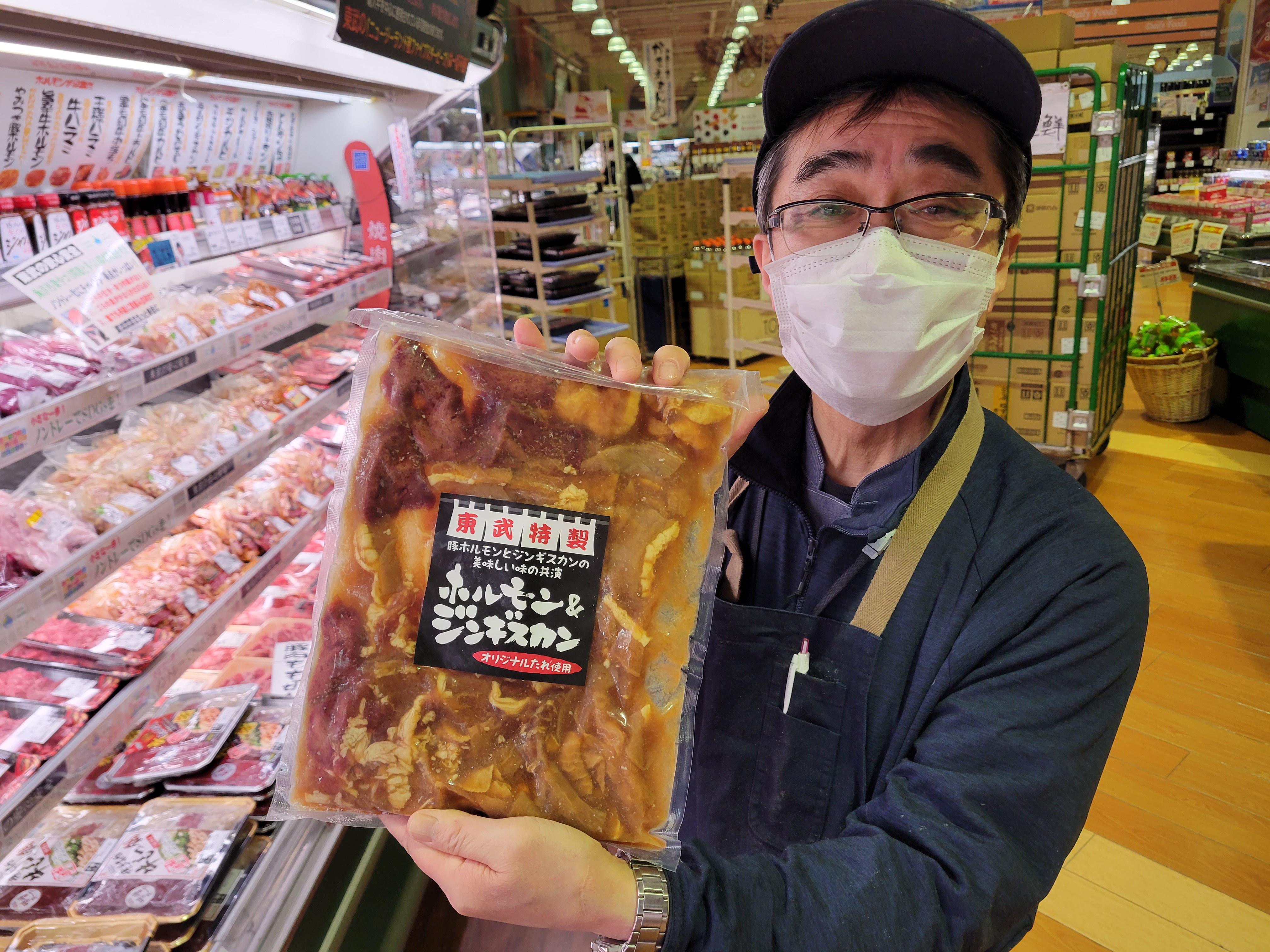 本日ミート担当、原さんのイチオシホルジンがおすすめです。豚ホルモンとジンギスカンの美味しい味の共演東武特製、このエリア東武だけの販売700g880円にて販売中今月の新商品です、ご利用下さいね😄