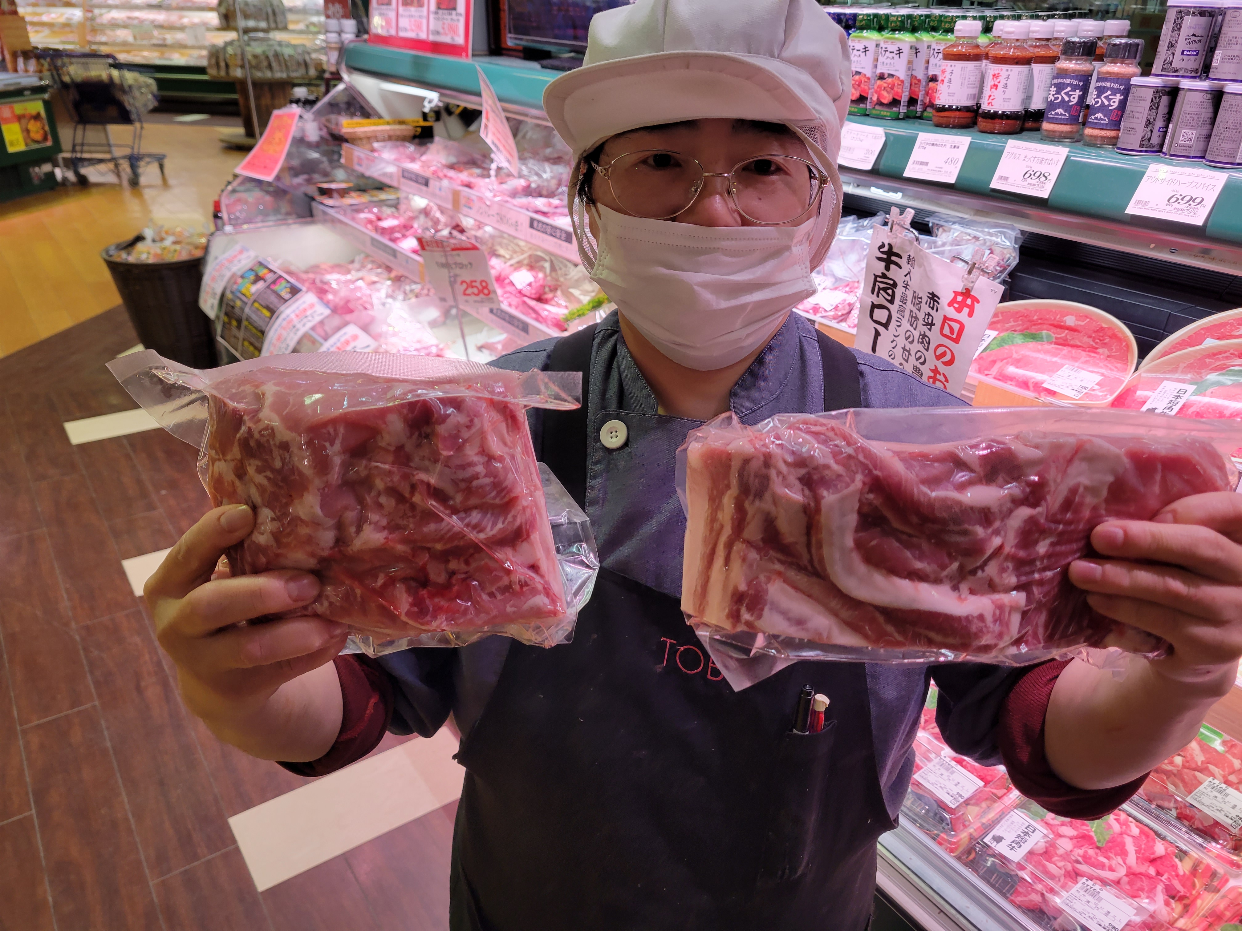 本日ミート担当、向山さんのイチオシノントレー豚肉ブロックバラ肉、ロース肉がおすすめです🎵真空パックだから日持ちする環境を考えゴミの削減にもなるそのまま冷凍保存も🆗‼️ご利用下さいね😄本日限定で100g当たり99円にて販売中