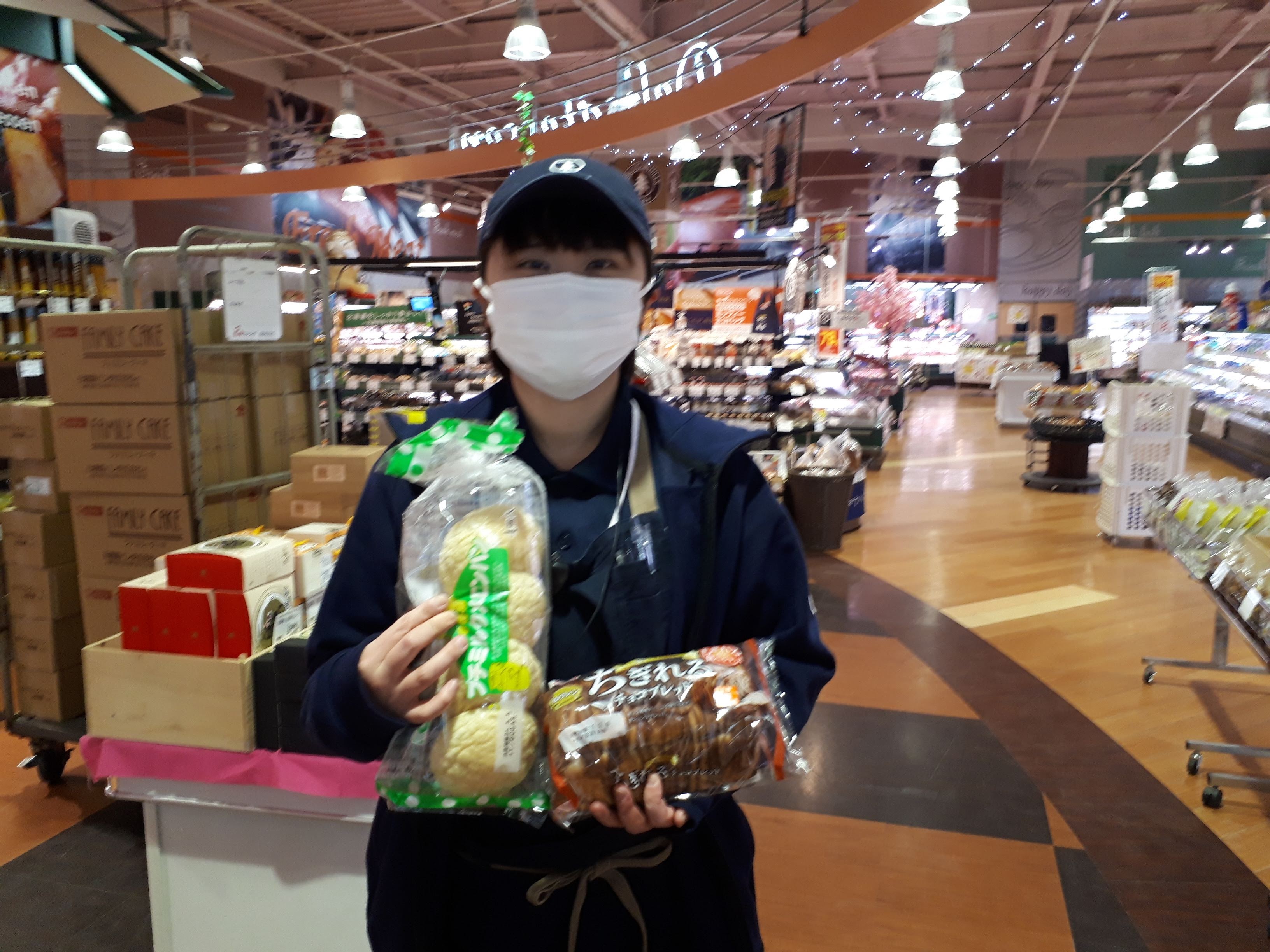 おはようございます。日配コーナー、本日は週末特価にて、大袋の菓子パンを販売致します。人気のちぎれるブレッドやツイストドーナツなどがお買い得です。ぜひ、お買い求めください。