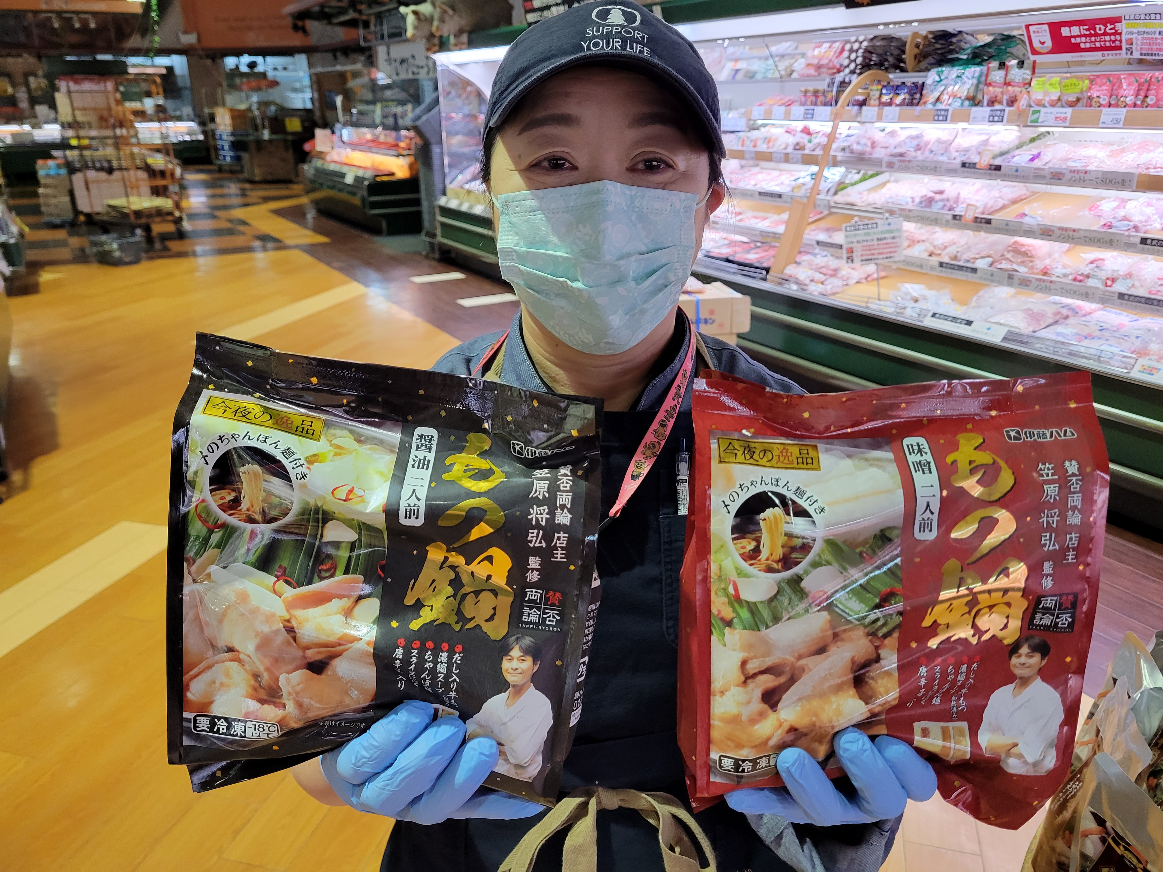本日ミート担当、宮崎さんのイチオシ笠原将弘監修、もつ鍋がおすすめだし入り牛もつ、濃縮スープ、唐辛子スライスにんにくが入って、〆のちゃんぽん麺もついてる新商品で味噌、醤油の2人前1080円で販売中、ご利用下さいね😄