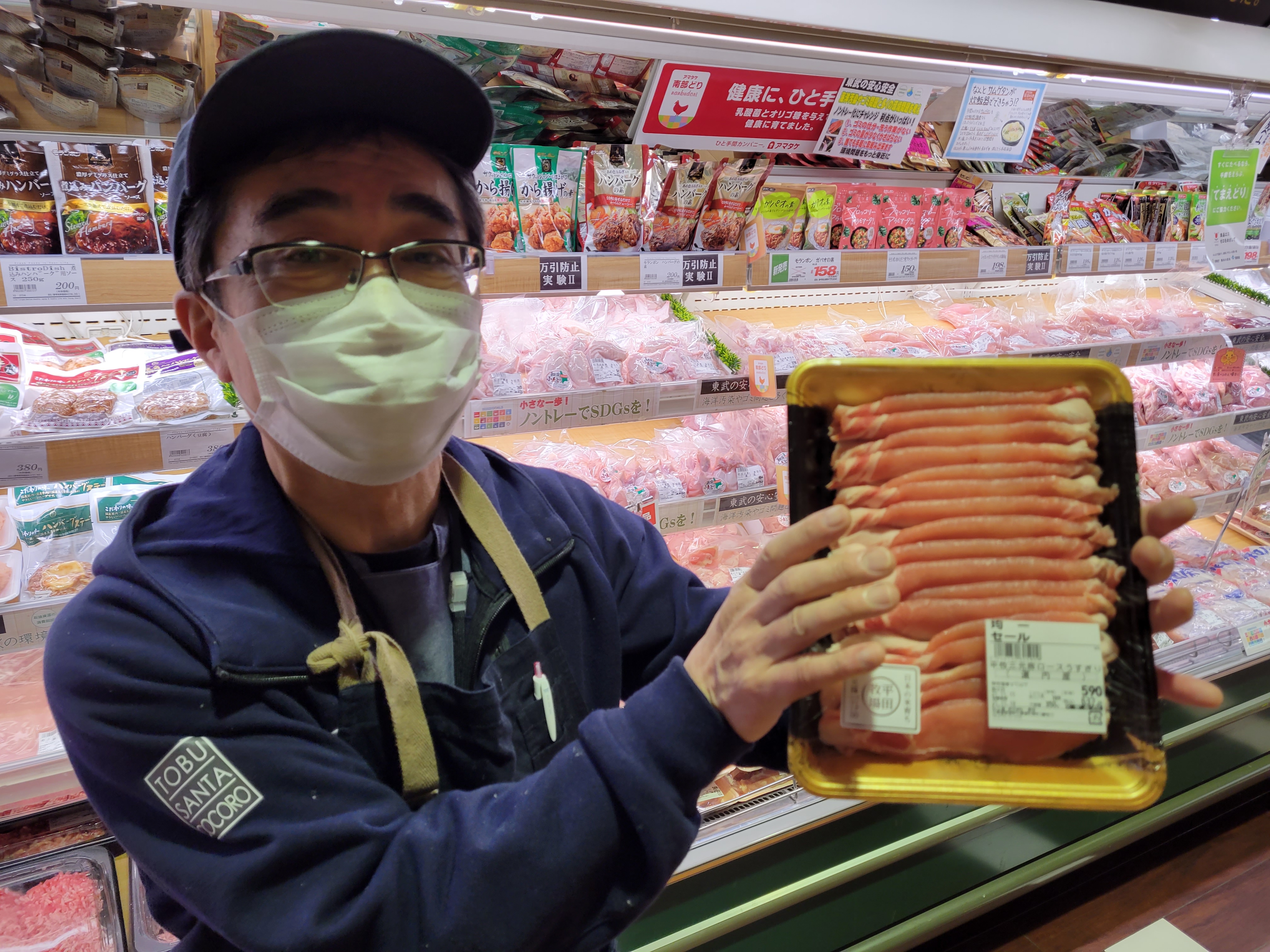 本日ミート担当、原さんのイチオシ平田牧場三元豚がおすすめです🎵黒豚のバークシャ―種を交配させたひと味もふた味も違う、特別の品種です三元豚ロース、バラ肉350g590円の均一特価にて販売中、ご利用下さいね