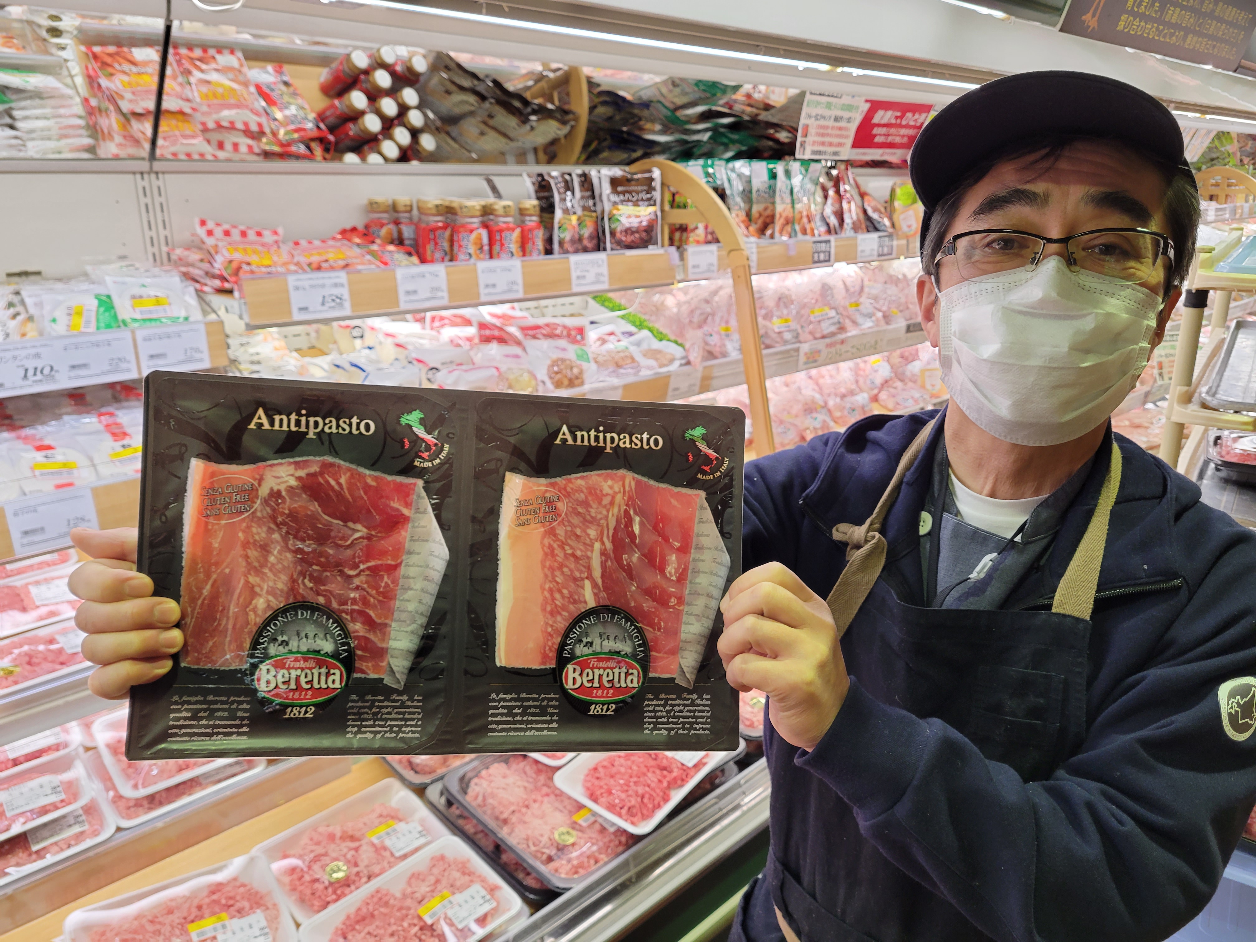 本日ミート担当、原さんのイチオシBerettaバラエティパック生ハムがおすすめです🎵ミラノサラミコッパ、プロシュート生ハムの3種の味が楽しめます😄250g1980円で販売中ボジョレー・ヌーボーのワインと一緒にオススメです🍷