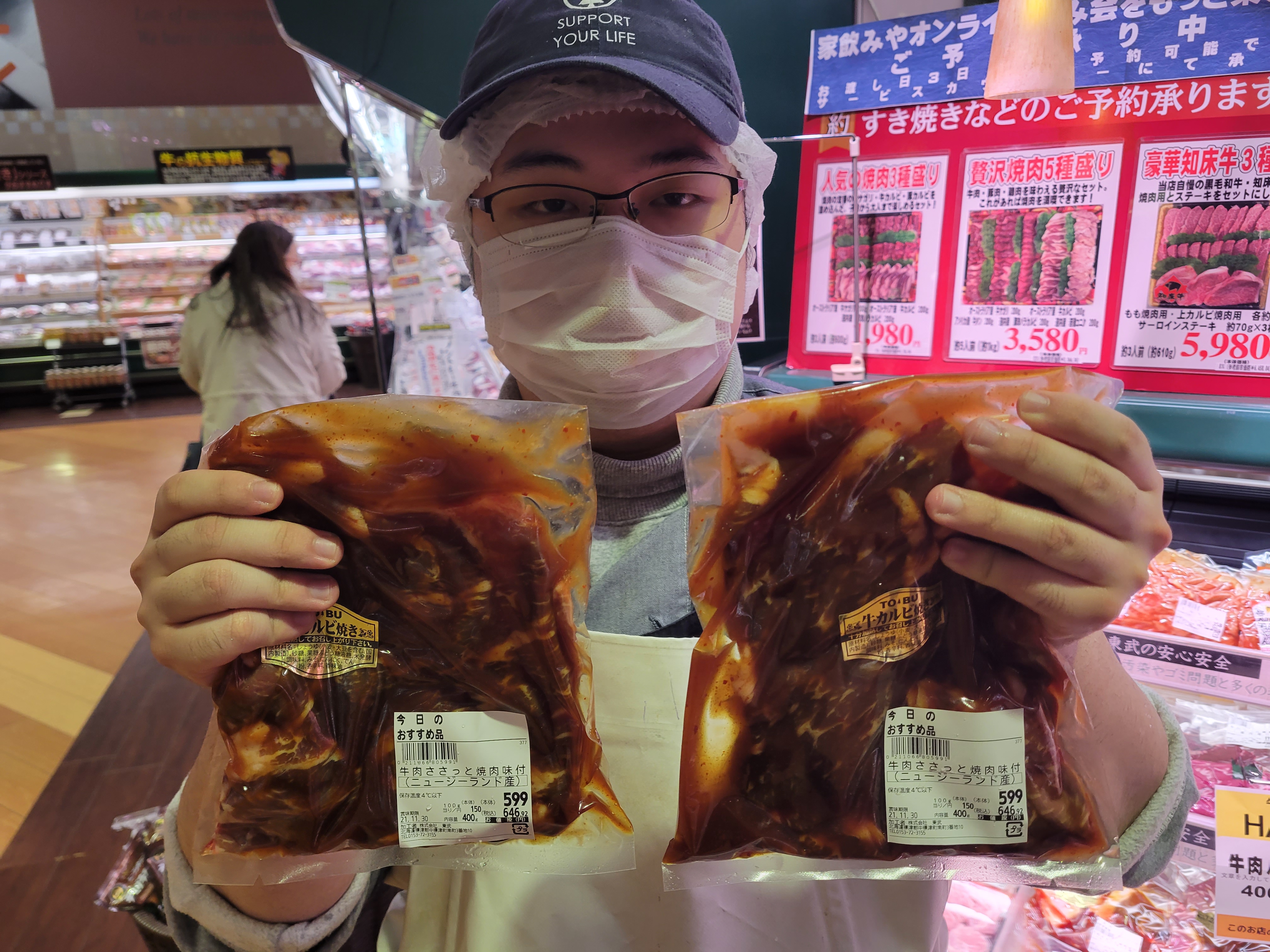 本日ミート担当、田中さんのイチオシニュージーランド産牛肉ささっと焼肉がおすすめです。輸入牛で最高ランクのモモ肉を使用薄切りだから、すぐに火が通る焼くだけ簡単今晩の夕食にいかがですか、400g599円にて販売中、ご利用下さいね🎵