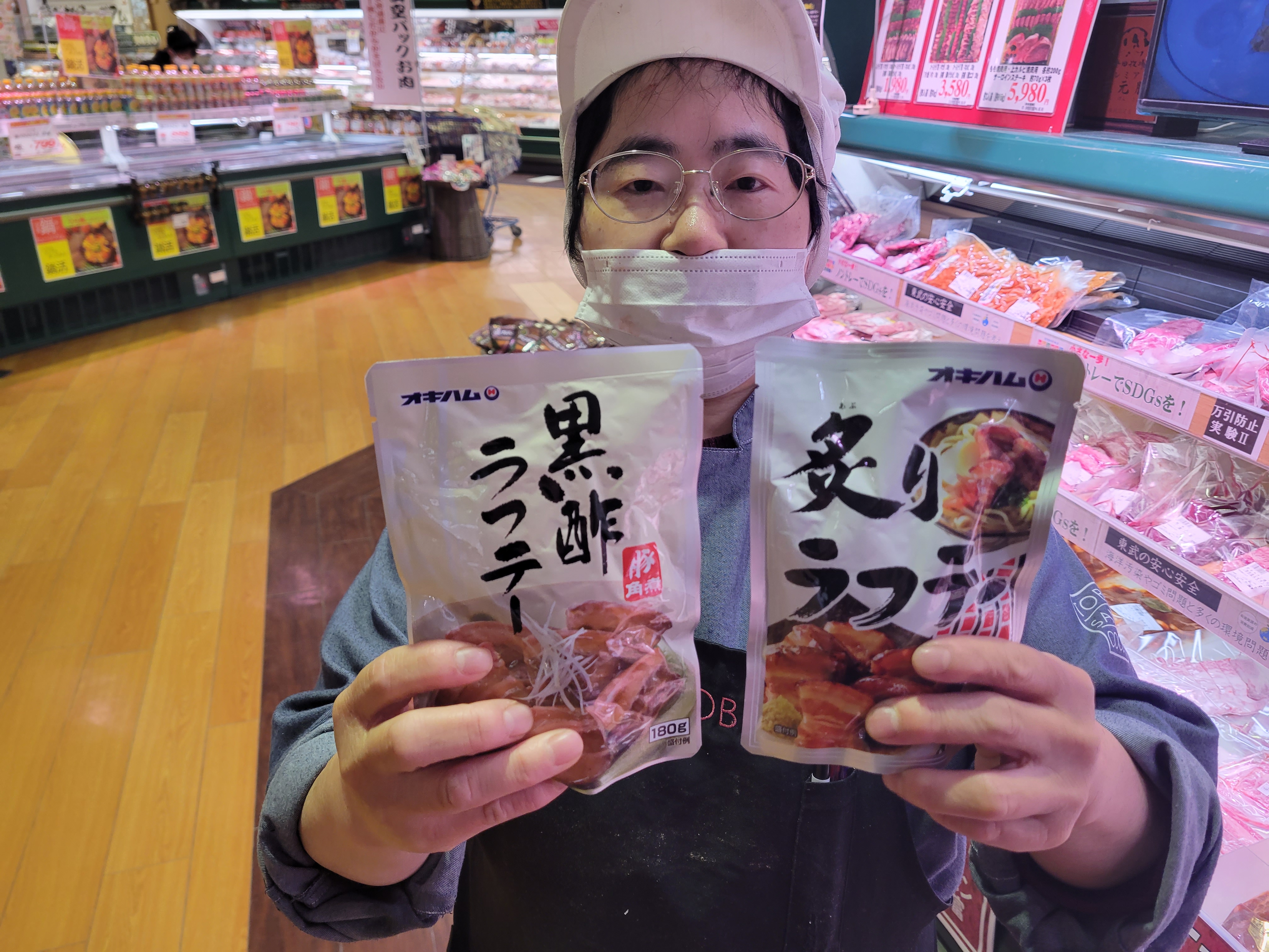 本日ミート担当、向山さんのイチオシオキハム炙りラフテーがおすすめ豚バラ肉を香ばしく炙りました。沖縄そばの具材、お酒の肴夕食の1品にご利用下さい1袋480円にて販売中ご利用下さいね🎵