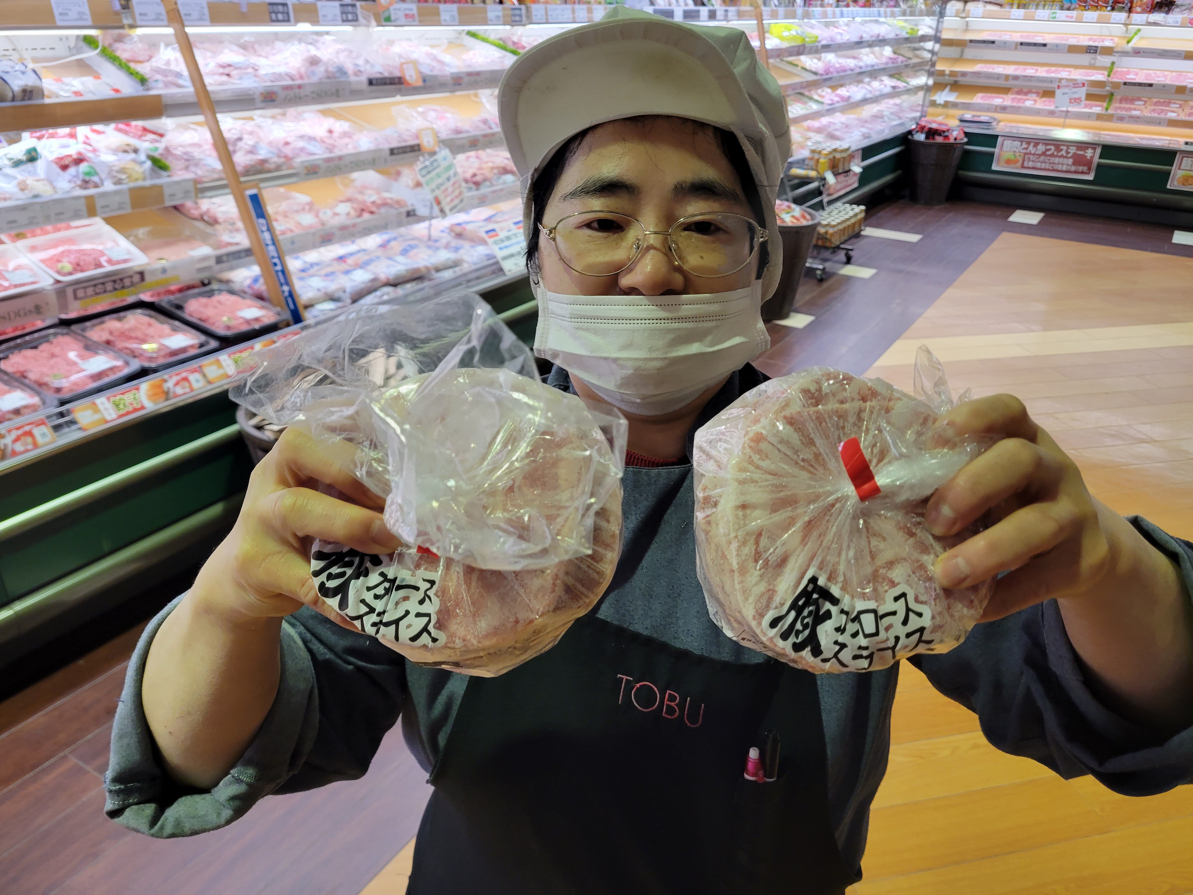 本日ミート担当、向山さんのイチオシ冷凍豚ジンギスカンがおすすめです。薄く豚肉肩ロースをスライス豚ジンギスカン用のお肉ですメーカー在庫過多にてお安く仕入れました🎵通常価格の500g798円の半額の399円で販売中、無くなり次第終了お早めにご利用下さいね😄