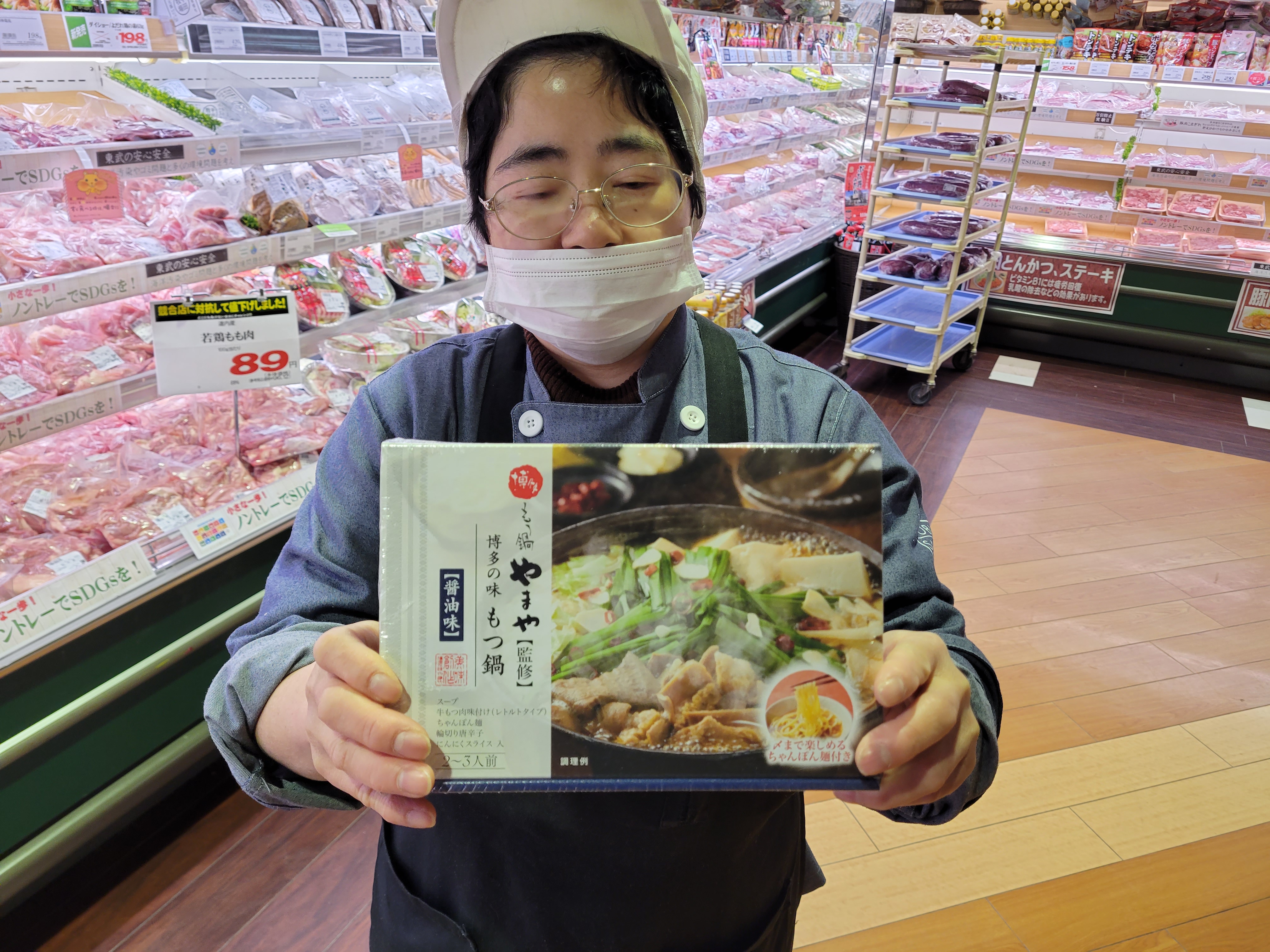 本日ミート担当、向山さんのイチオシ博多もつ鍋やまやがおすすめです🎵もつ鍋専門店のご家庭で楽しめる新鮮な国産牛モツを使用ちゃんぽん麺付きで〆まで楽しめます2~3人前で1200円で販売中ご利用下さいね😄