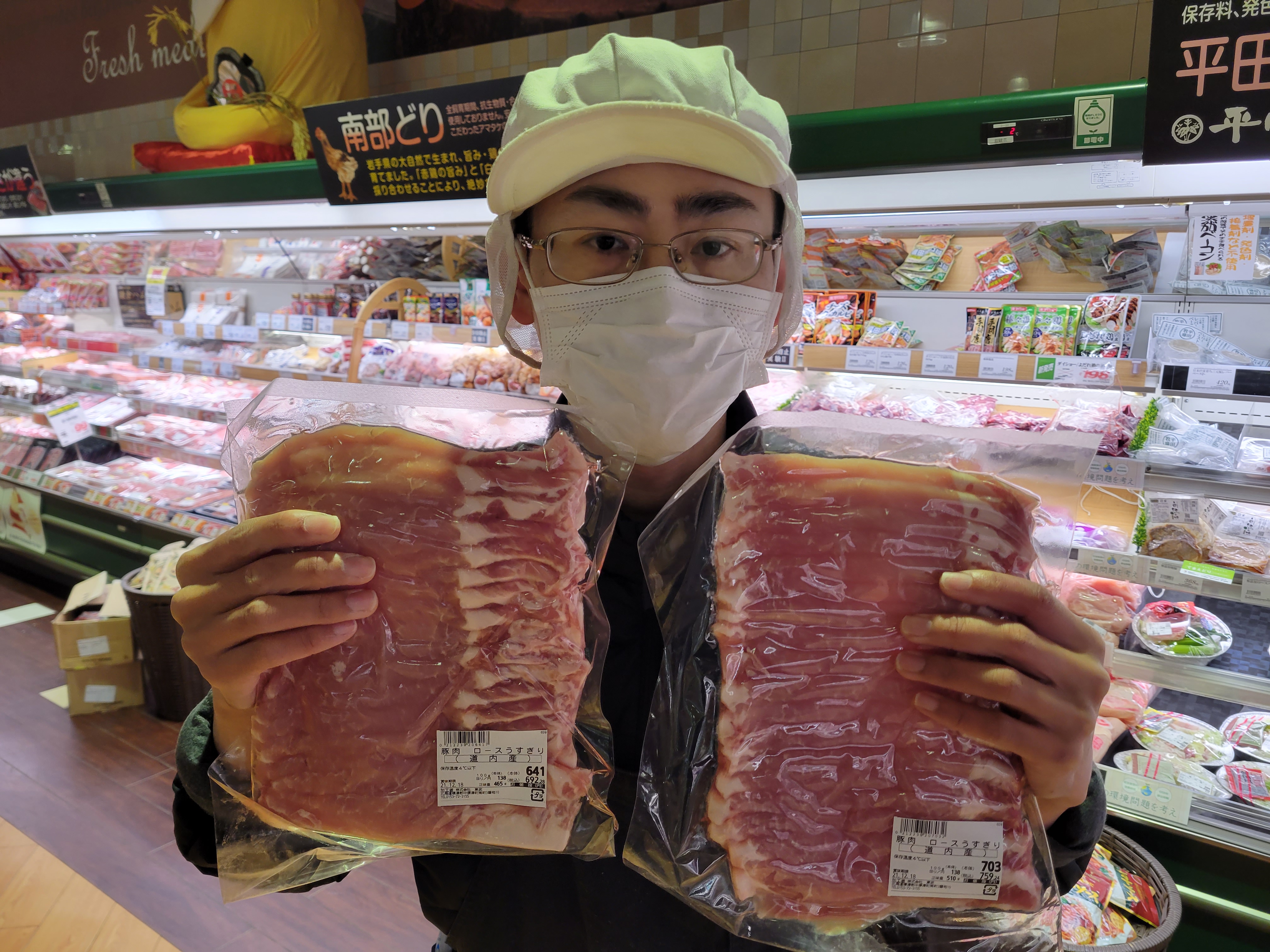 本日ミート担当、小平さんのおすすめかみふらのポークロース薄切りがイチオシです、ノントレー商品でゴミの仕分け、洗う作業がなくかさばらない、賞味期限もありおすすめです。本日は競合店に対抗して100g当たり138円にて販売中ご利用下さいね🎵