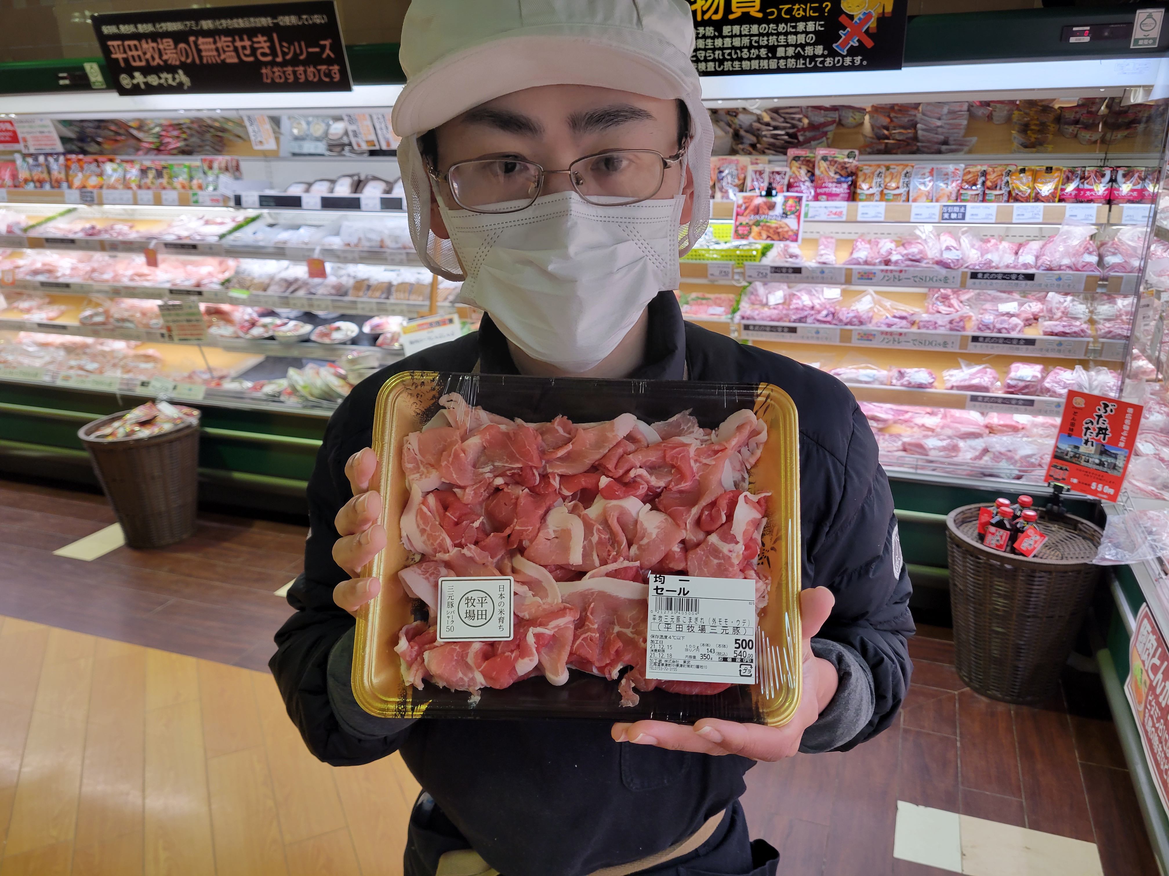 本日ミート担当、小平さんのおすすめ平田牧場三元豚小間切れがイチオシ黒豚のバークシャ種を、交配させたひと味も、ふた味も違う特別の品種350g500円で販売中ご利用下さいね🎵