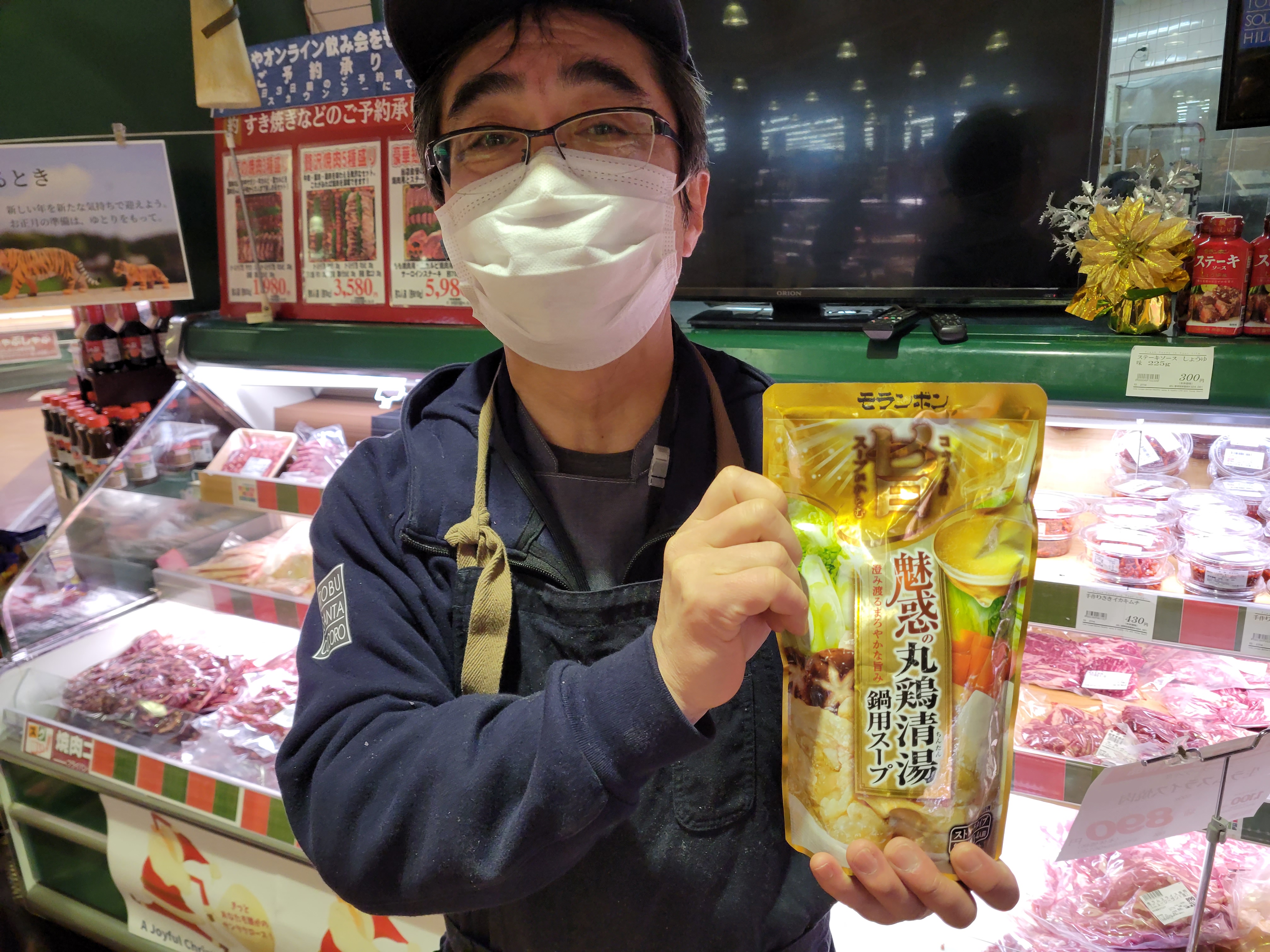 本日ミート担当、原さんのおすすめモランボン魅惑の丸鶏清湯鍋用スープイチオシです🎵テレビでも紹介丸鶏だし旨みが凝縮した清湯をベースに鶏油をブレンドしたまろやかな味わいです本日は鶏肉もも100g当たり95円で販売中、一緒にご利用下さいね😄