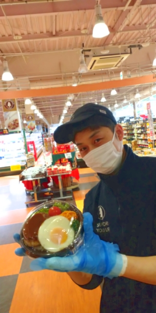 おはようございます。お惣菜コーナーではチーズINハンバーグロコモコを販売中。クリスマス限定商品となっております。ハンバーグの中からとろっとチーズが。美味しい逸品となっております。ぜひご利用ください。