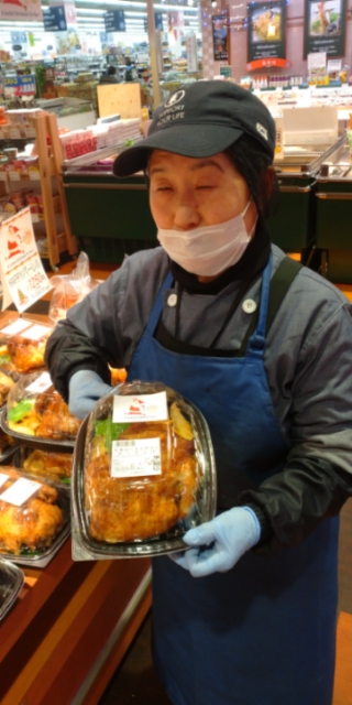 おはようございます。お惣菜コーナーでは丸鶏ローストチキンを販売中。クリスマスといえばチキン!店内味付けでふっくら美味しいローストチキンとなっております。ぜひご利用ください。