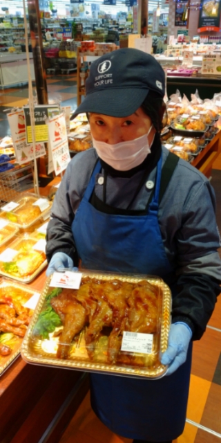 おはようございます。お惣菜コーナーではローストレッグを販売中。チキンを囲んでみんなでクリスマス!甘みのある照り焼き味です。ぜひご利用ください。