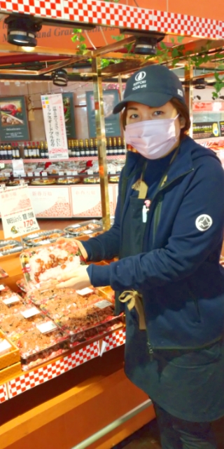 おはようございます。お惣菜コーナーではお赤飯を販売中。豆には甘納豆をたっぷり使用したふっくら美味しいお赤飯です。また正月限定で美味安心の小豆赤飯も販売中。ほんのり甘くて美味しいお赤飯、是非ご利用ください