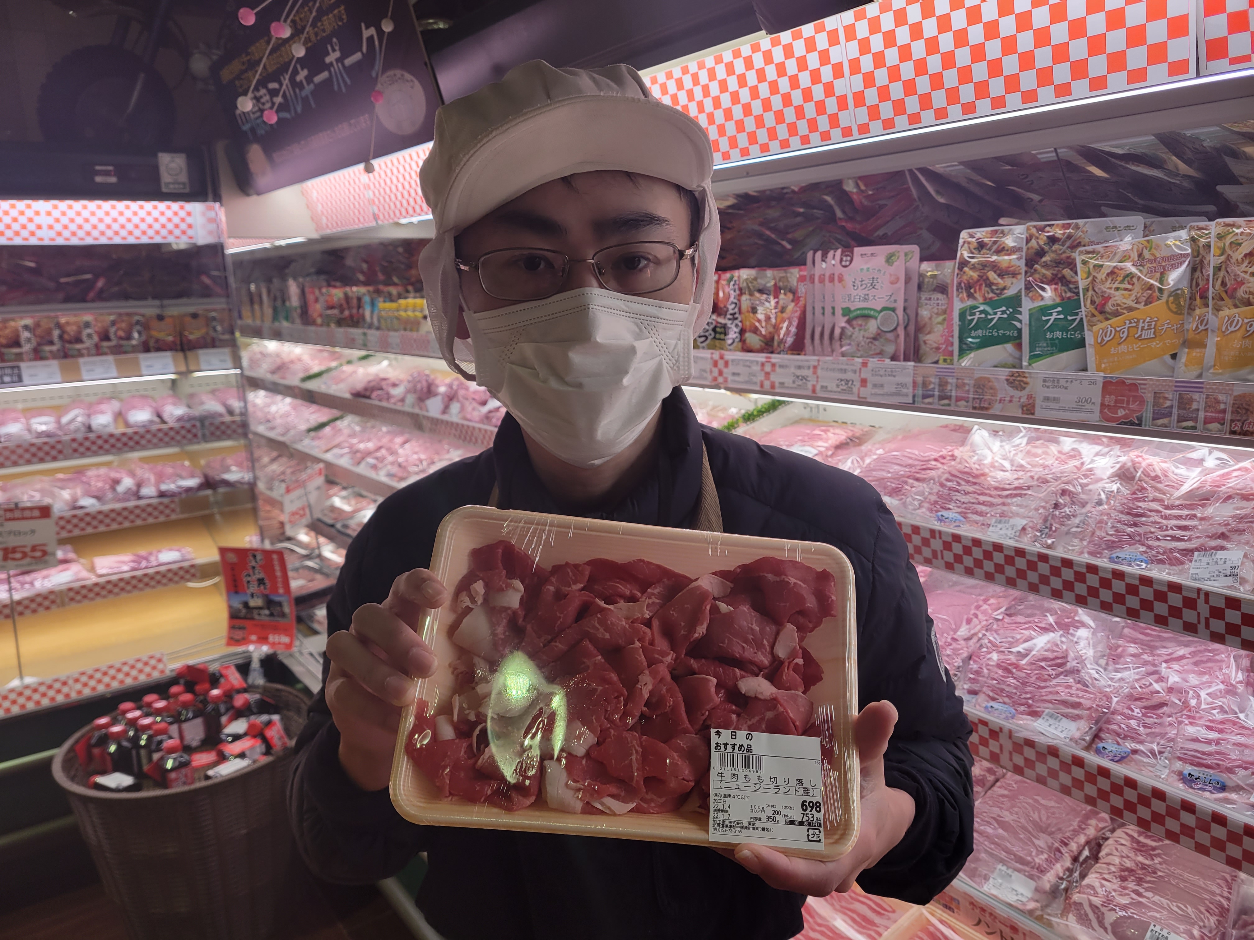 本日ミート担当、小平さんおすすめニュージーランド産牛肉もも切り落としがイチオシです🎵国産牛肉に匹敵美味しさ😄3人前、約300g698円で販売中ご利用下さいね😄