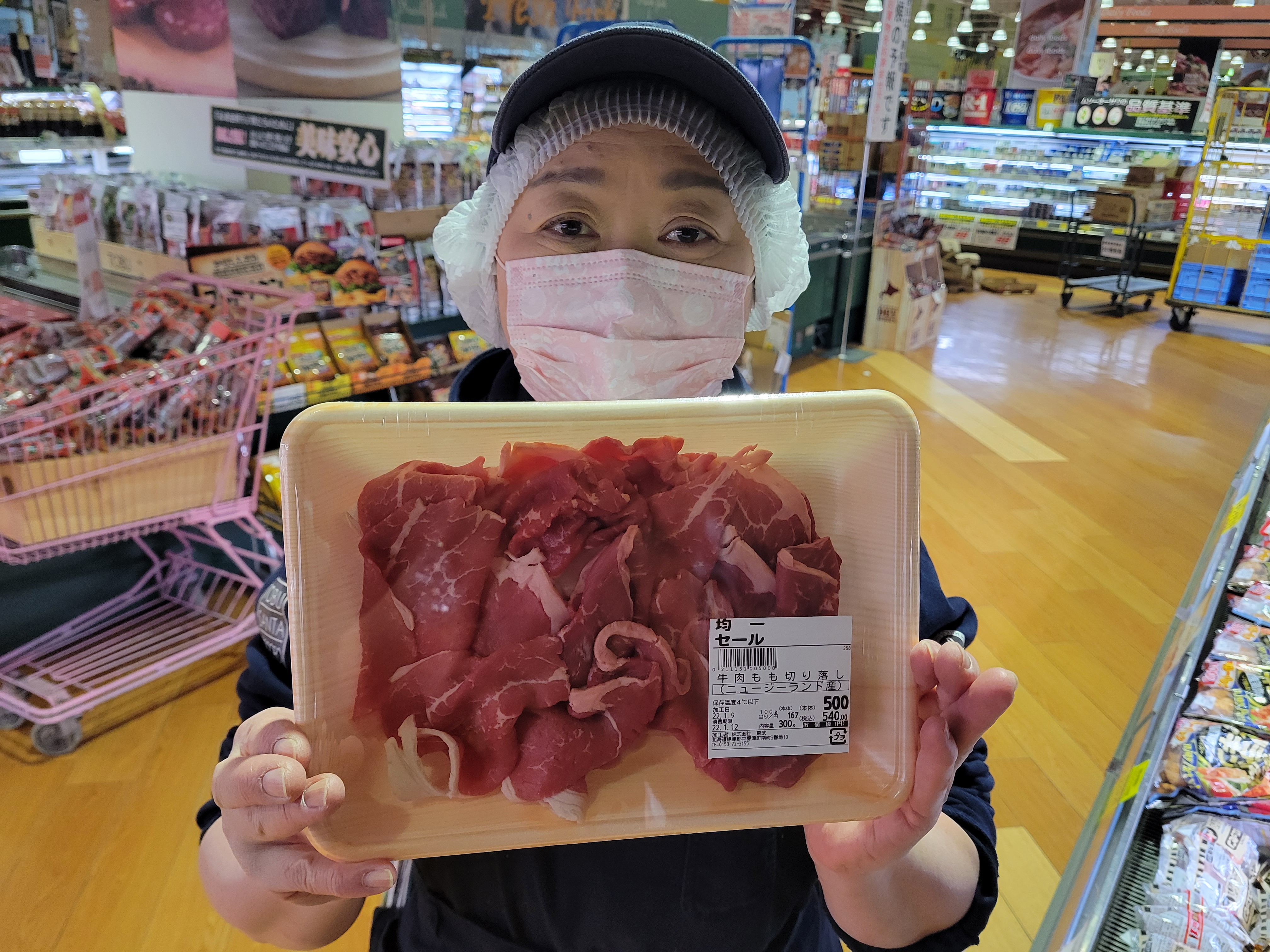 本日ミート担当、宮崎さんのおすすめニュージーランド産ファイブスタービーフ牛もも切り落としがイチオシ当社指定の牧場から入荷遺伝子組み換え作物不使用抗生物質不使用の安心安全な牛肉300g500円にて販売中