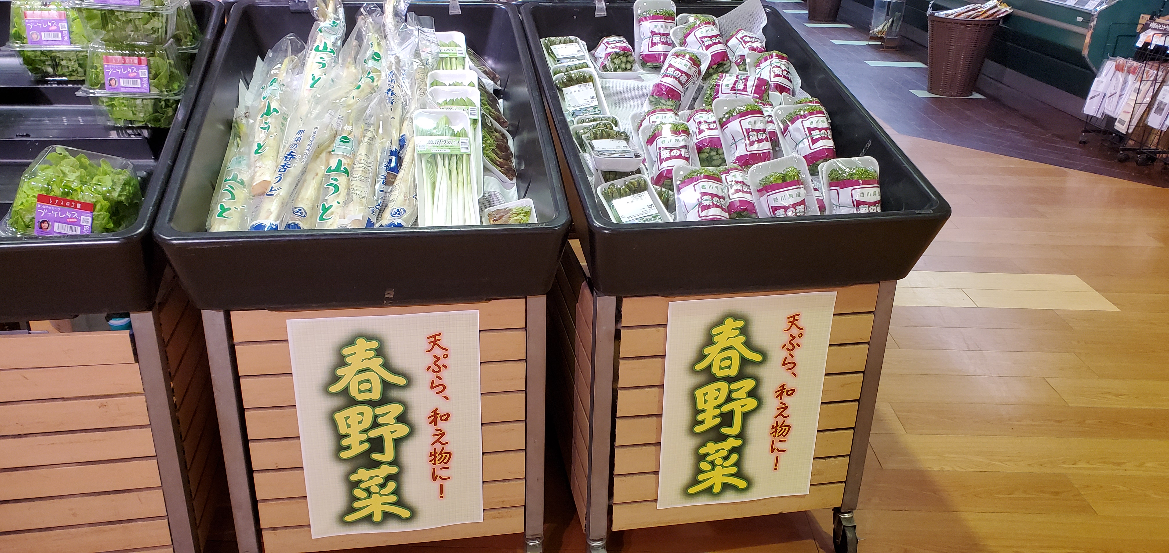 青果コーナーは春の野菜が入荷しました。こごみ、菜の花、うど、うるい、たらの芽です。天ぷらや和え物にいかがですか?ご利用お待ちしています。(^-^)