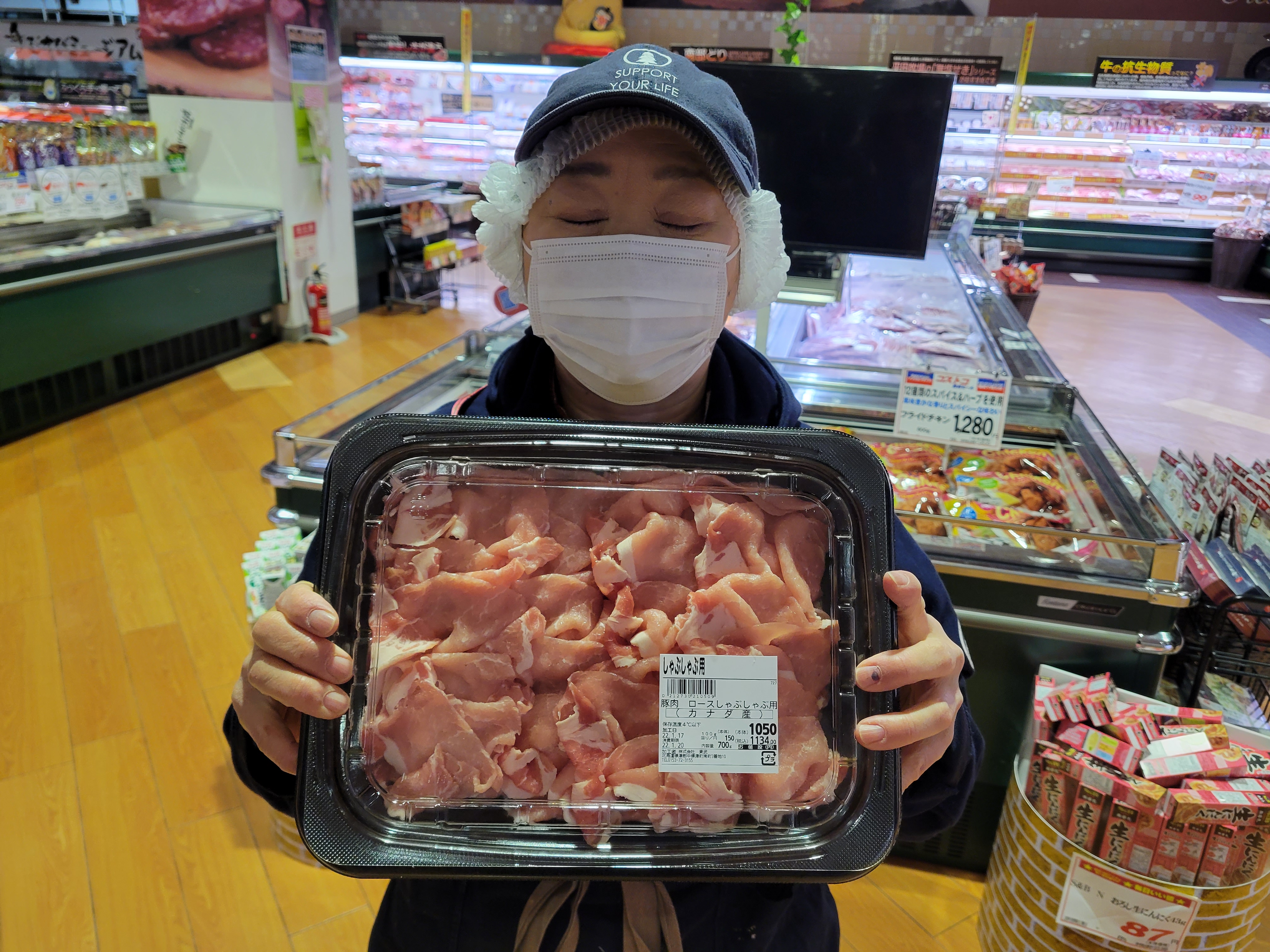 本日ミート担当、宮崎さんのおすすめメガ盛りしゃぶしゃぶがイチオシ茹でことにより余分脂が落ちお野菜もたっぷりとれヘルシーカナダ産メガ盛りしゃぶしゃぶ700g1080円で販売中ご利用下さいね🎵