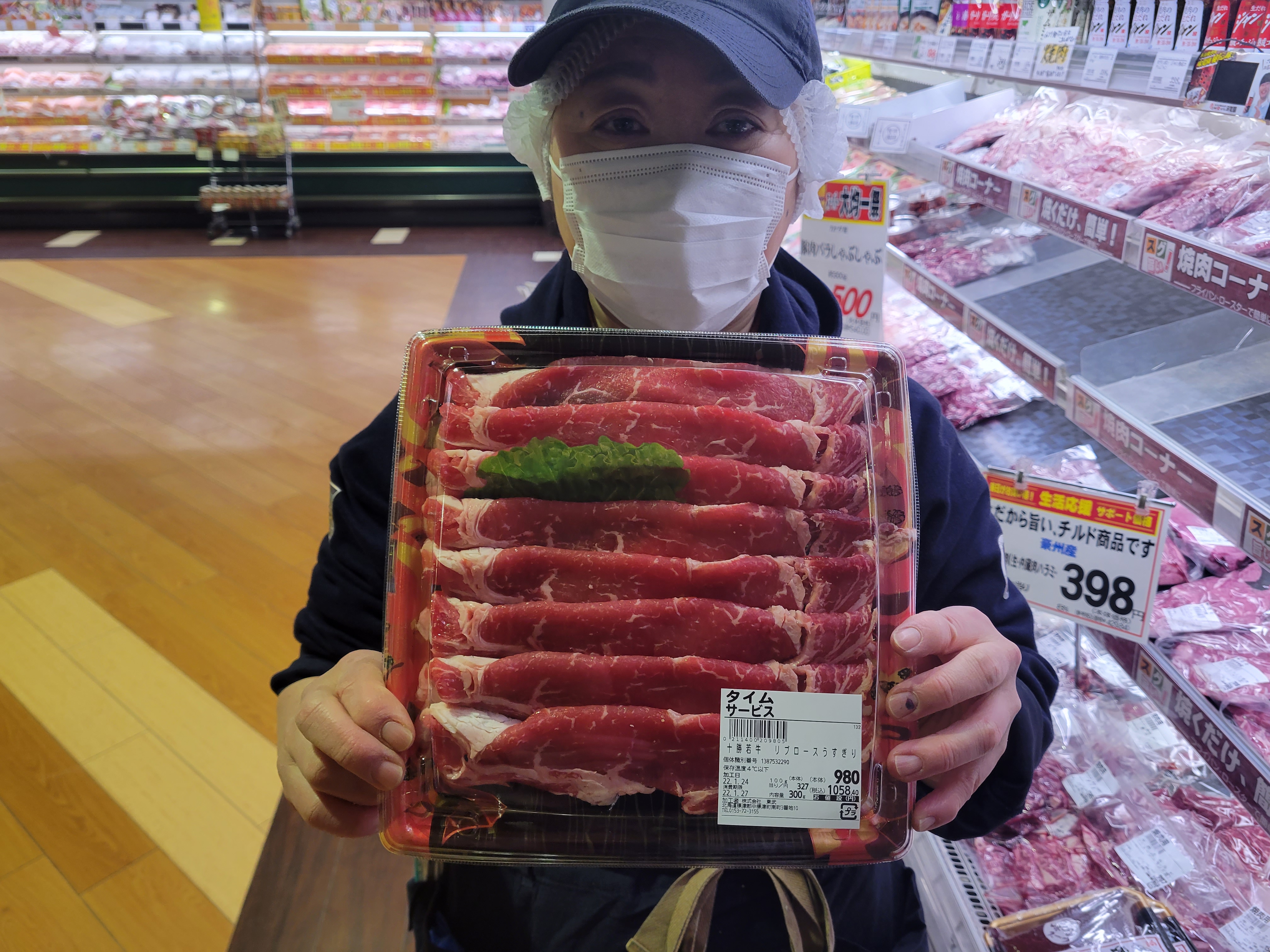 本日ミート担当、宮崎さんのおすすめ十勝若牛ロースすき焼きがイチオシ赤身が多く、お肉の王様サーロインで商品作りしました。本日限定で3人前300g980円にて販売中ご利用下さいね🎵
