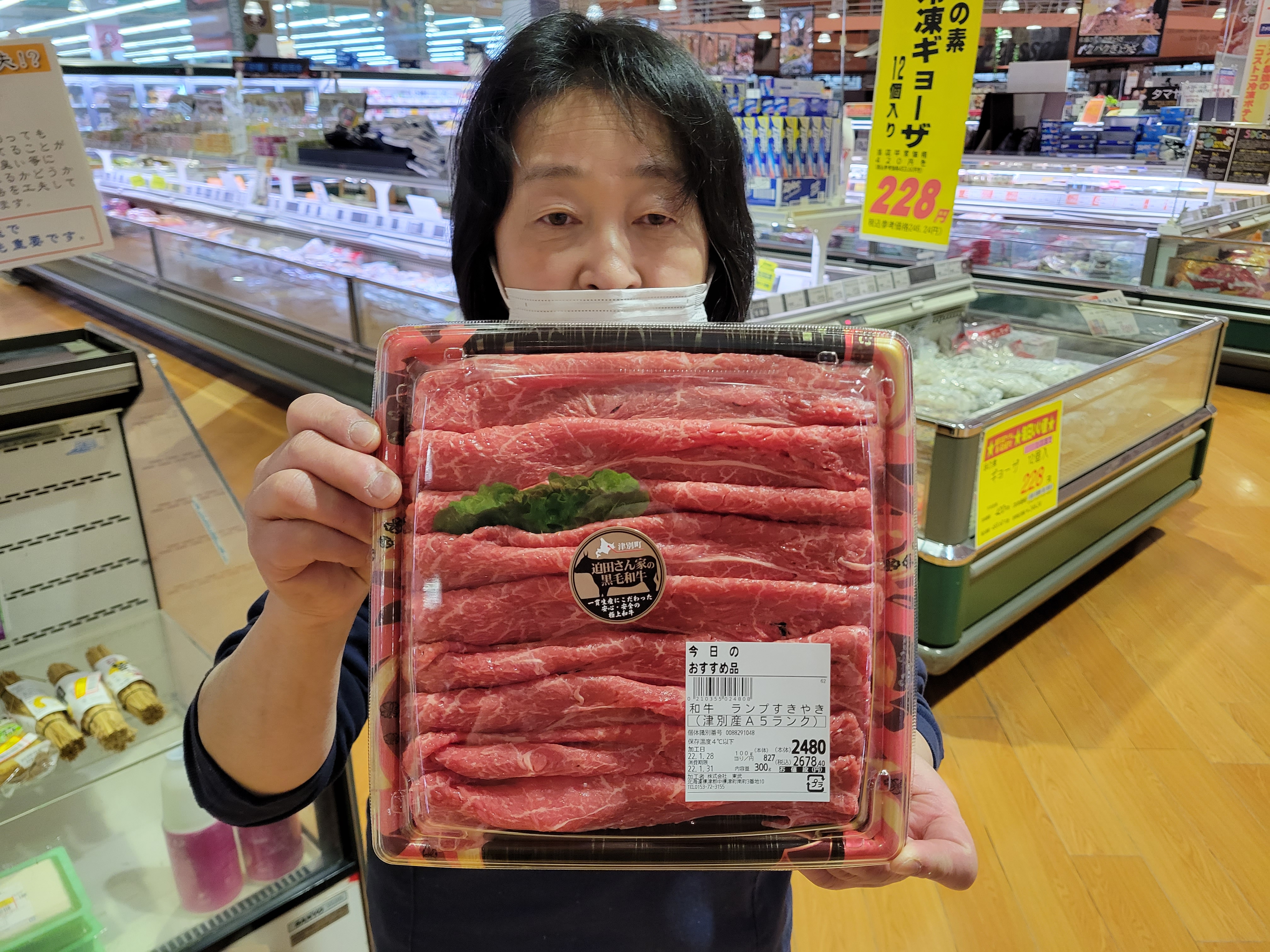 本日ミート担当、平間さんのおすすめ迫田さん家の津別牛、ランプすき焼き用がイチオシです🎵1頭から約2kgしか取れないモモ肉の希少部位、霜降りの甘さ赤身の旨みが合わさった商品です。3人前約300g2480円で販売中ご利用下さいね🎵