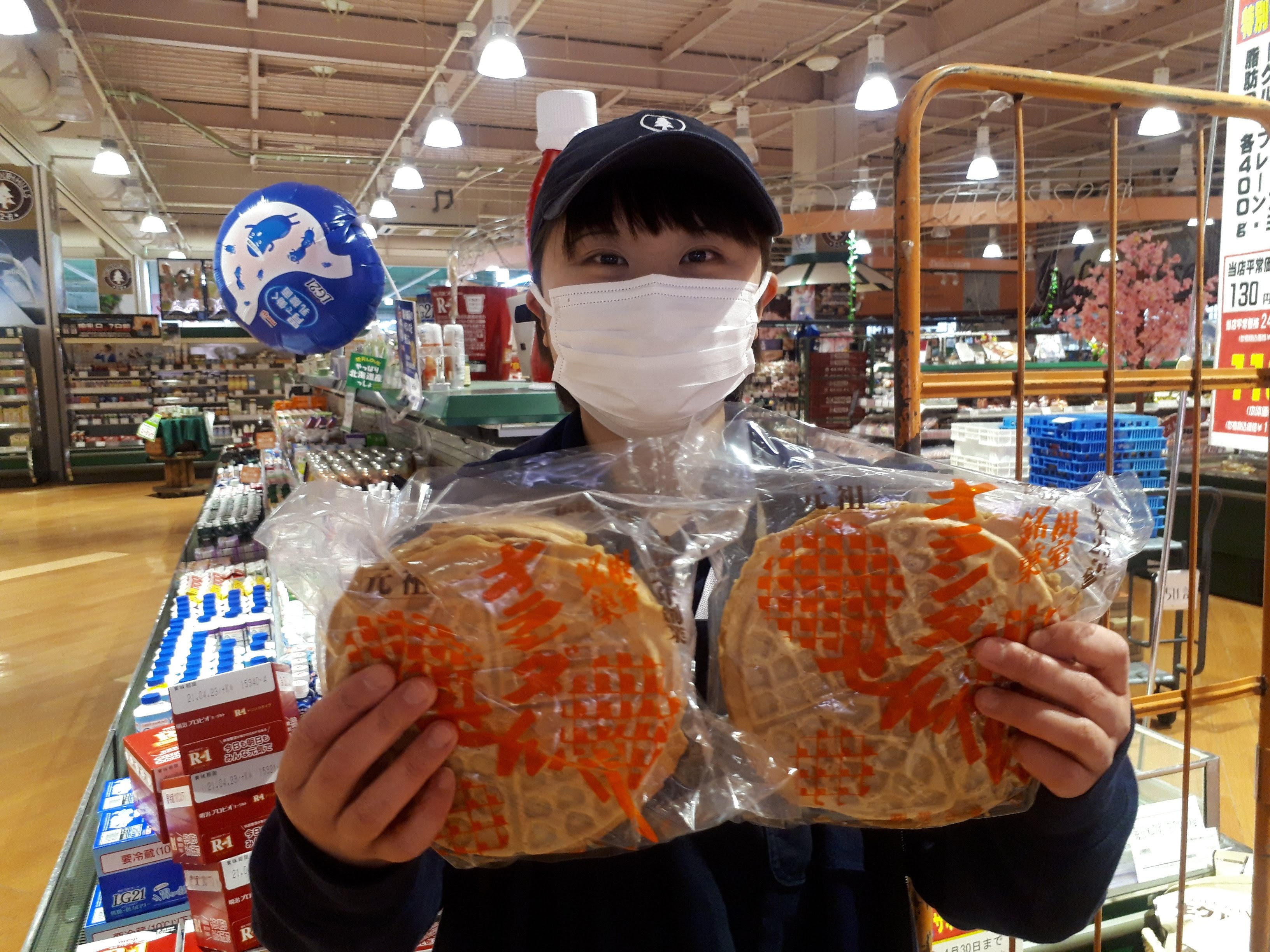 おはようございます。日配コーナーでは、地元根室のオランダせんべいを販売しています。お土産にも使える人気商品です。ぜひお買い求めくだ下さい