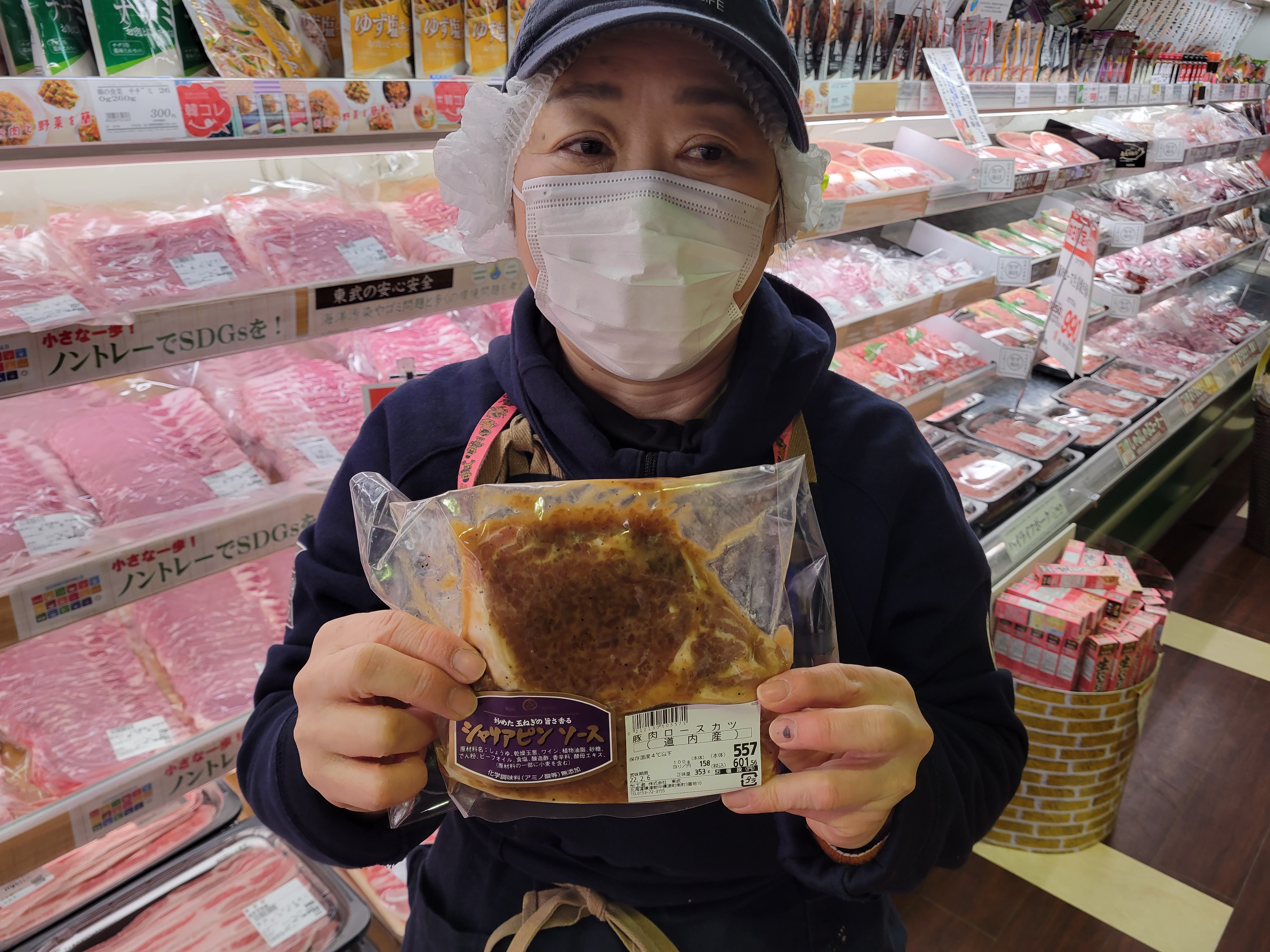 本日ミート担当、宮崎さんのおすすめ豚肉ロースシャリアピンステーキがイチオシです🎵炒めた玉ねぎの旨さ香る無添加のタレで売れております。道内産豚シャリアピンステーキ100g当たり158円で販売中ご利用下さいね🎵