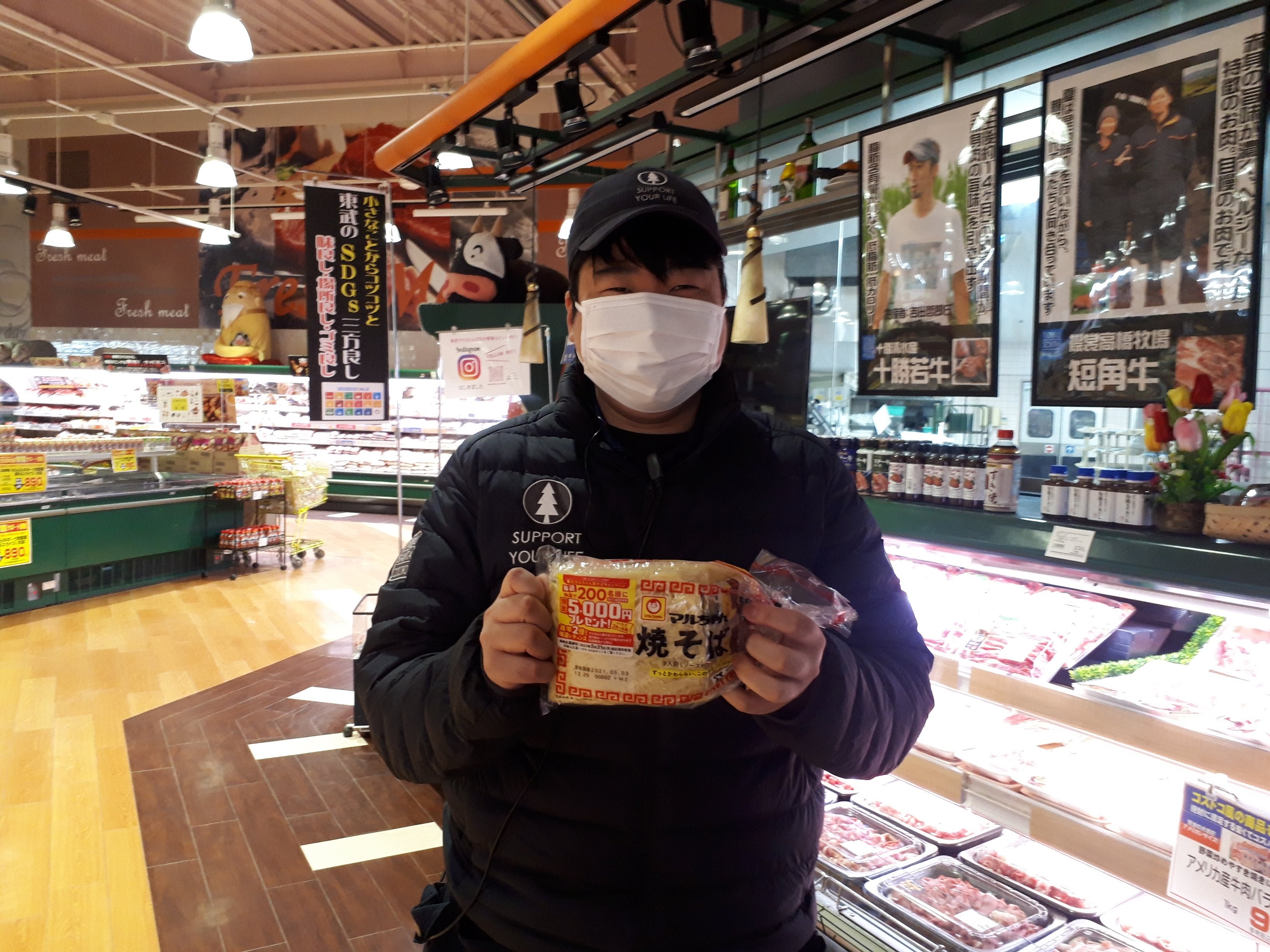 おはようございます。日配コーナーでは、今月のお買い得商品として、マルちゃんの焼きそばを168円にて、販売しています。ぜひお買い求め下さい。