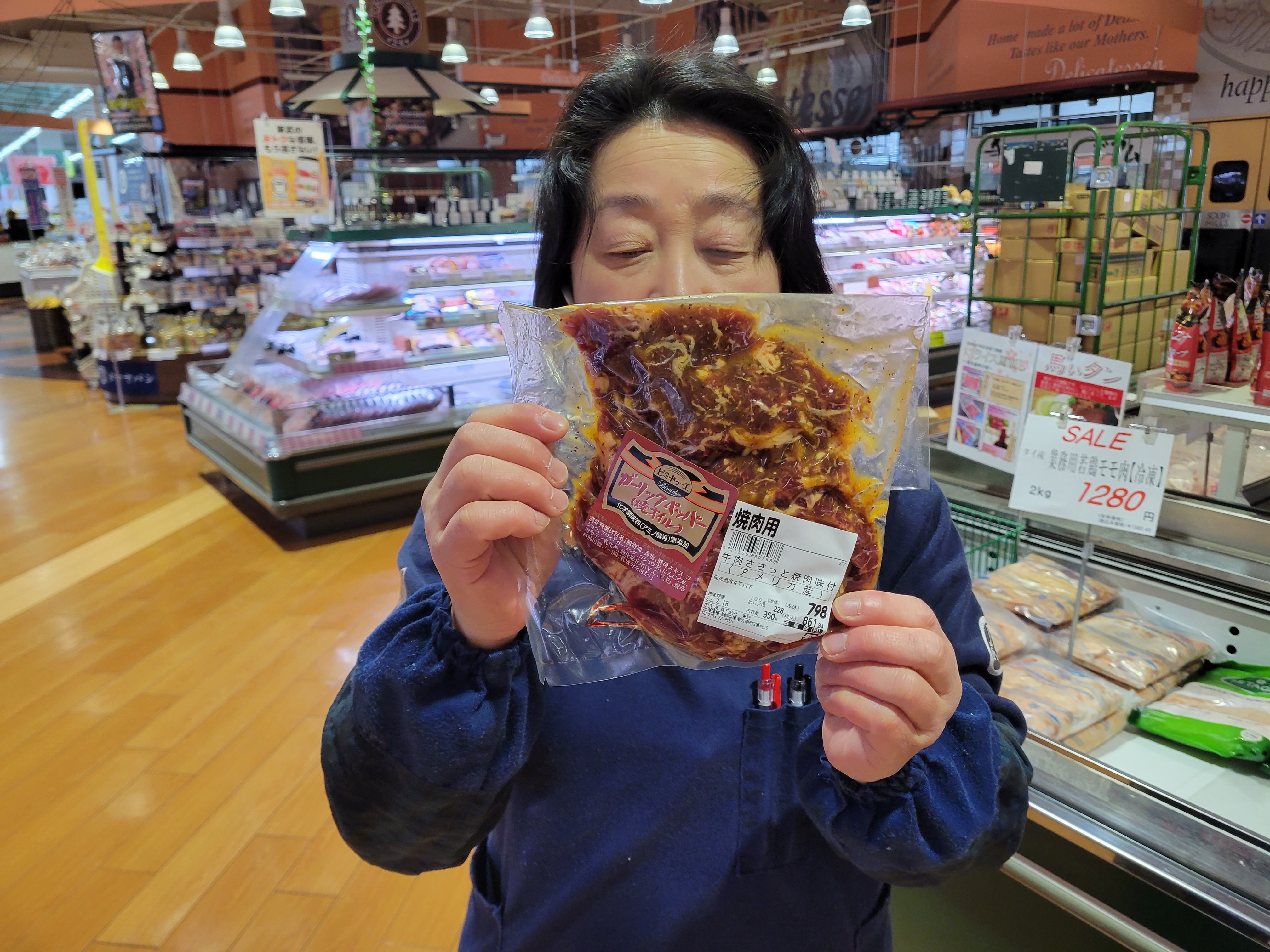 本日ミート担当、平間さんのおすすめガーリックペッパー焼肉がイチオシ牛肉肩ロース薄切り肉をガーリックペッパー焼きオイルで味付け、フライパンで簡単焼肉今晩の夕食にご利用下さいね、🎵