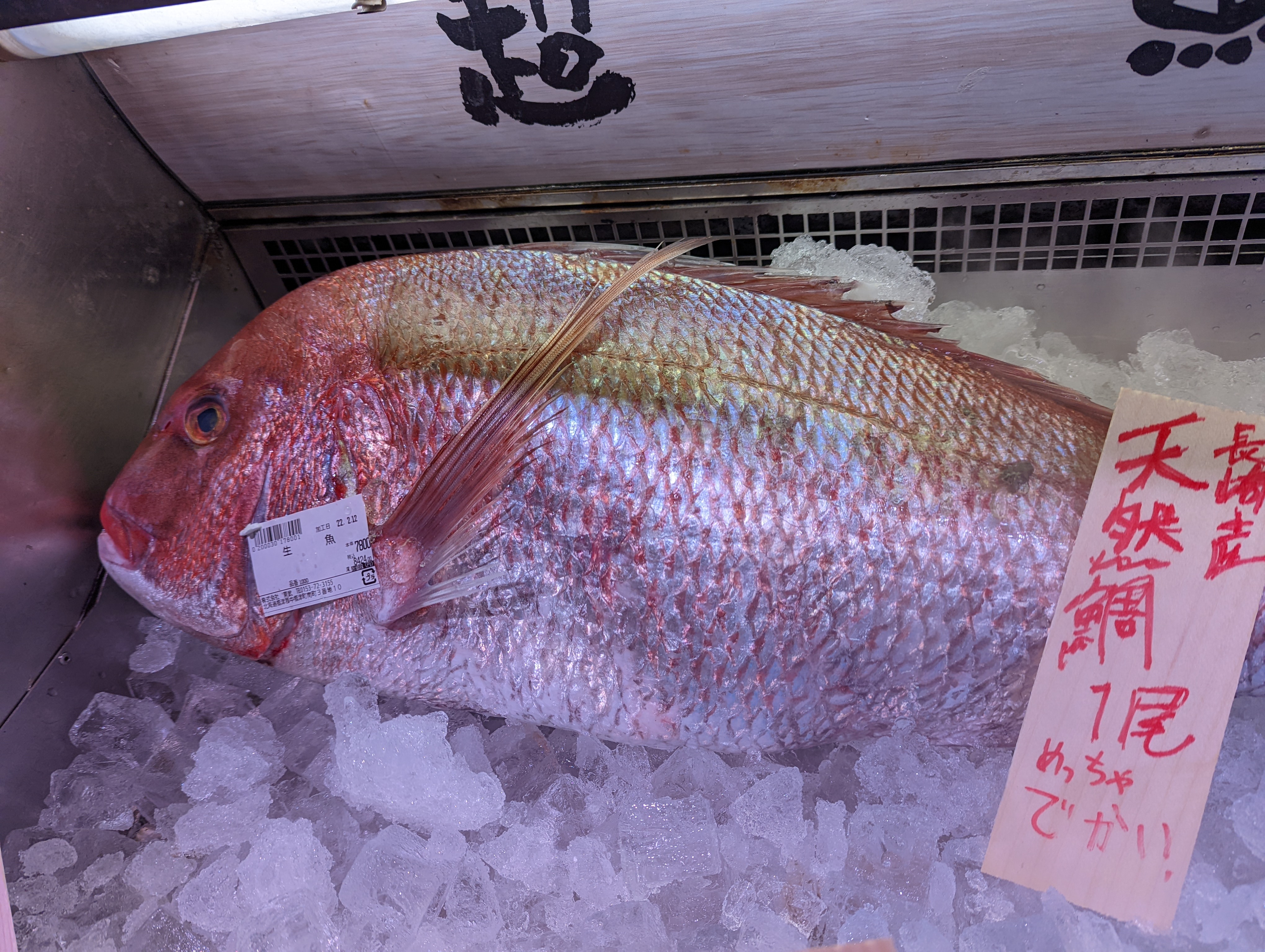 鮮魚コーナーでは天然鯛をはじめ福岡から新鮮なお魚を販売中です!是非ご利用ください!