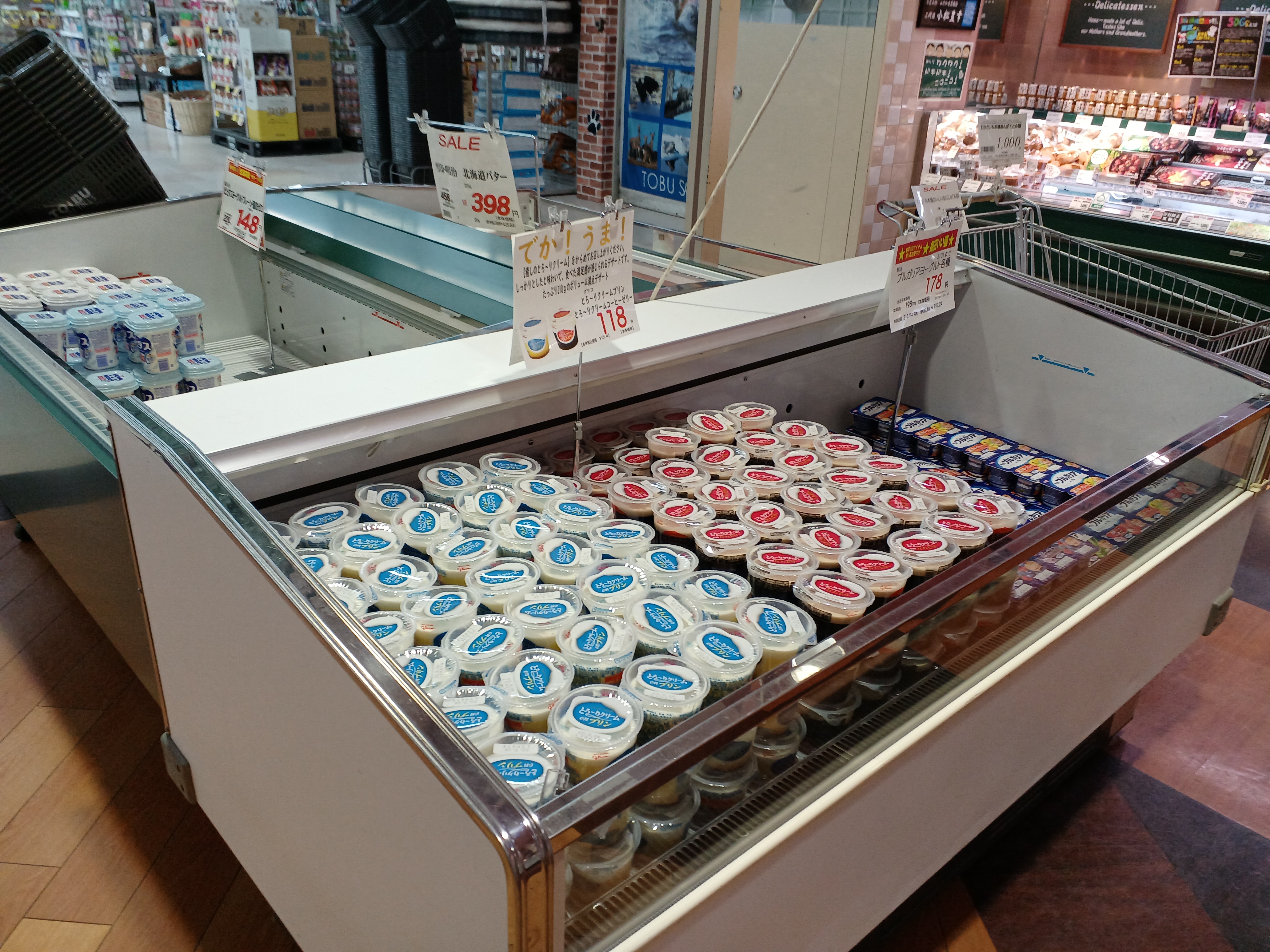 おはようございます。日配コーナーのおすすめは、グリコのクリームonプリン、コーヒーゼリー。本日は、118円とお買い得です。ぜひお買い求め下さい。