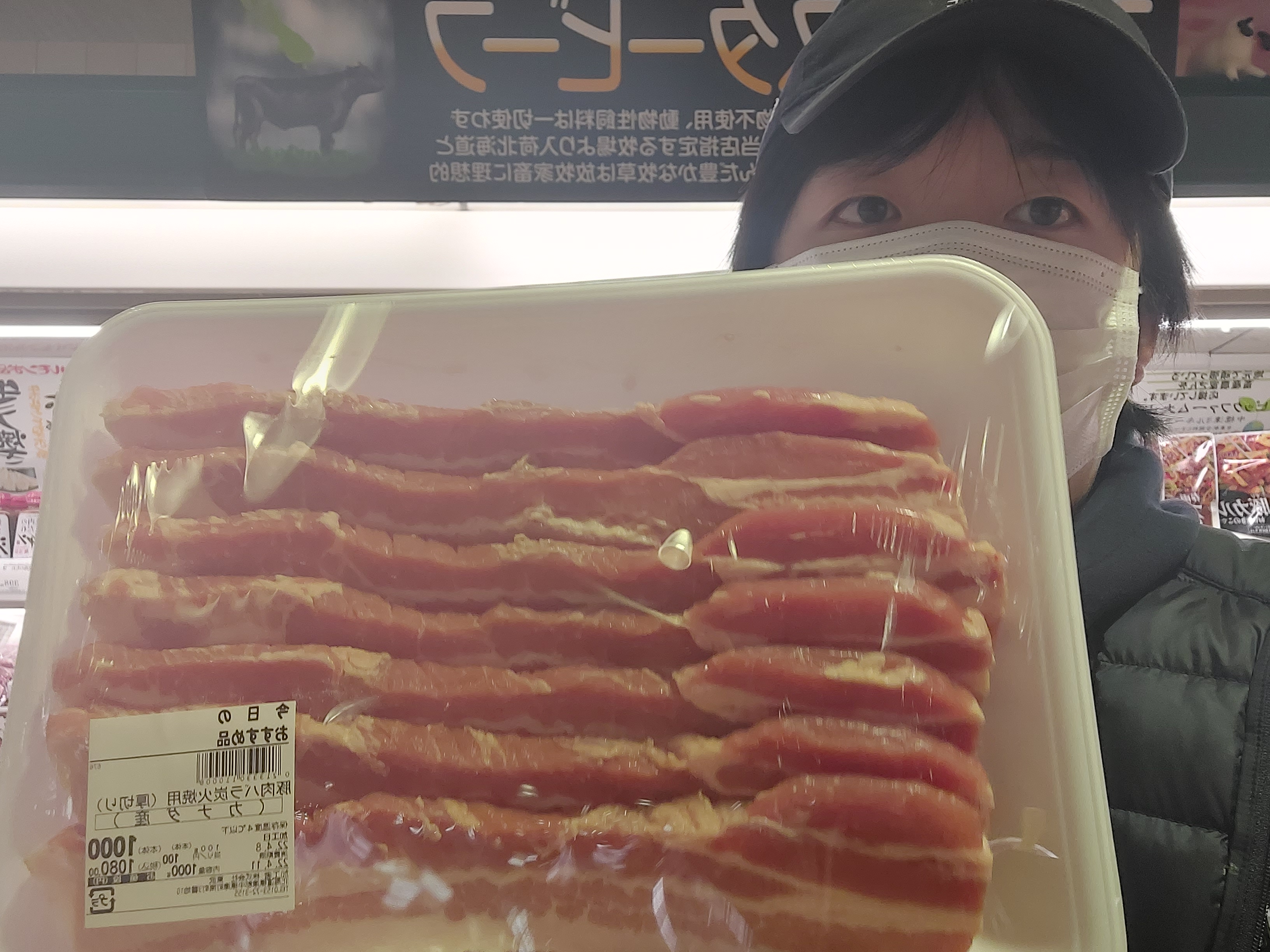 おはようございます! 本日のオススメはカナダ産バラ肉の厚切り焼肉です! ドーンと1キロ1000円!
