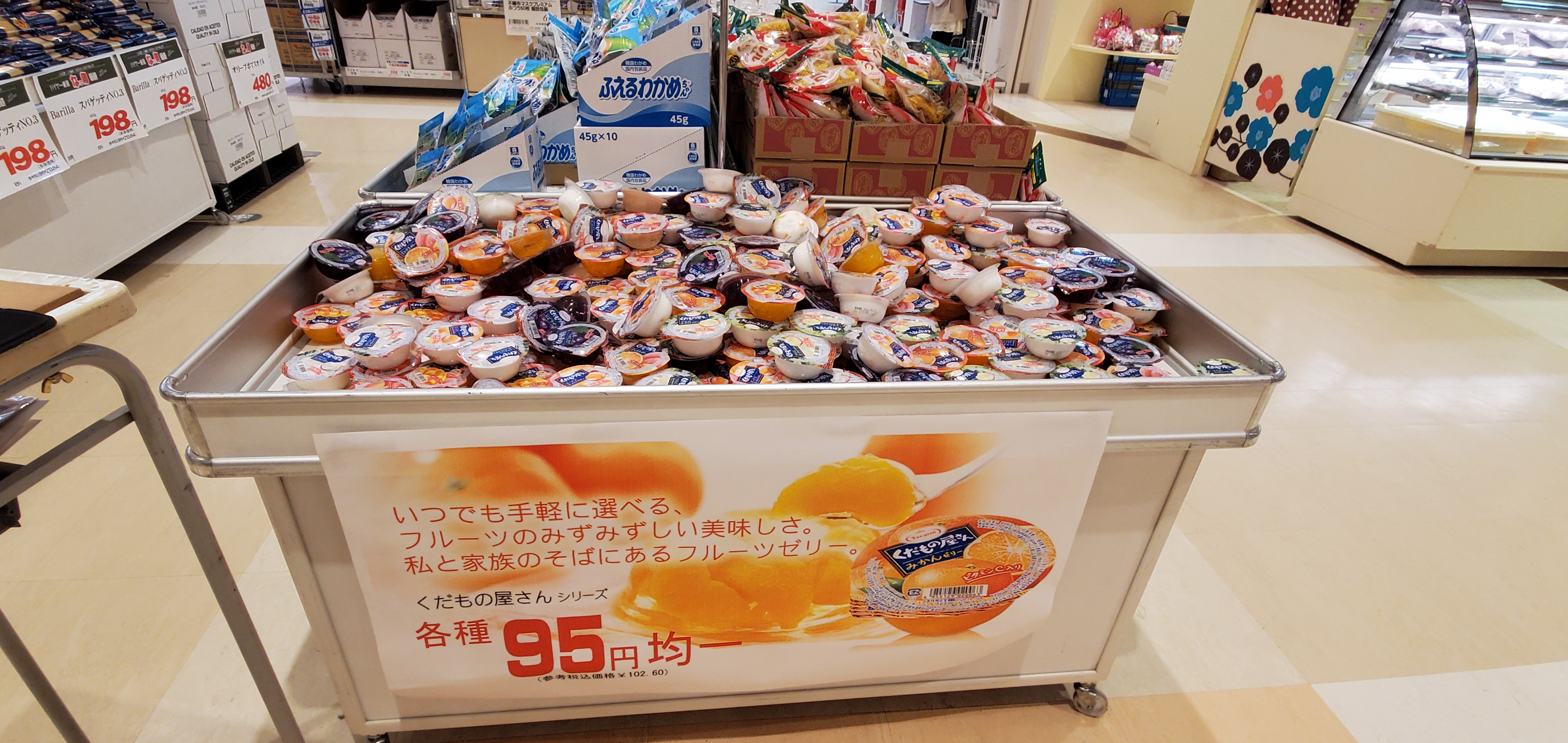 青果コーナーからオススメで人気のたらみカップゼリーを選べる8種類の品揃えとお買い得価格で販売しています。そのままでも美味しいですがオススメは熱い日のために凍らせておくといいですよ!ぜひ、ご利用お待ちしています。(^-^)