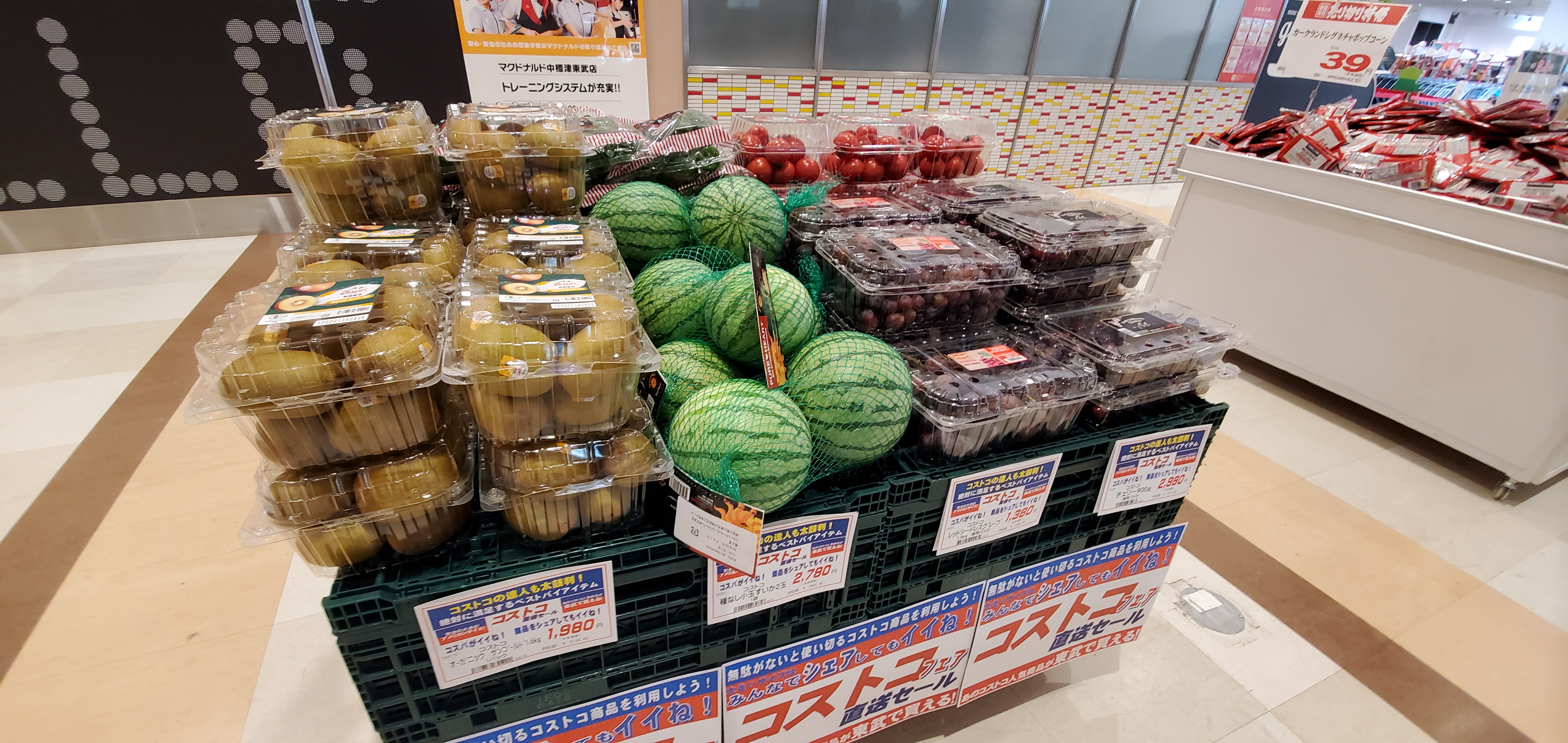 今日から人気のコストコフェアを開催しています。青果からコストコで販売しているアメリカンチェリー🍒や種無し小玉スイカ、オーガニックゴールドキウイ、天然水トマトなど販売しています。各コーナーでもコストコ商品が品揃えしています。ぜひ、ご利用お待ちしています。(^-^)