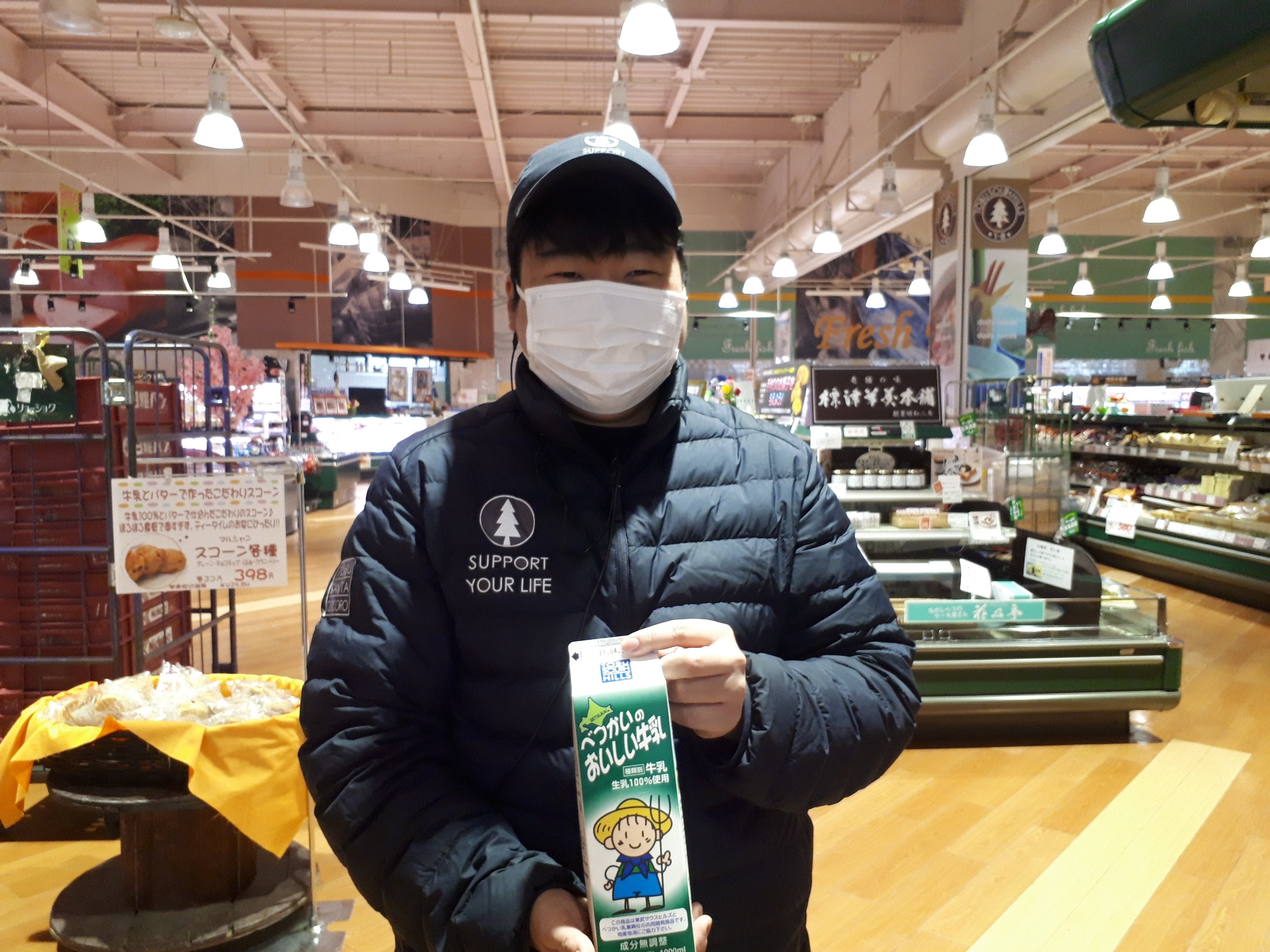 おはようございます。日配コーナーでは、べつかいのおいしい牛乳を149円にて販売します。本日だけのお買い得です。ぜひお買い求め下さい。