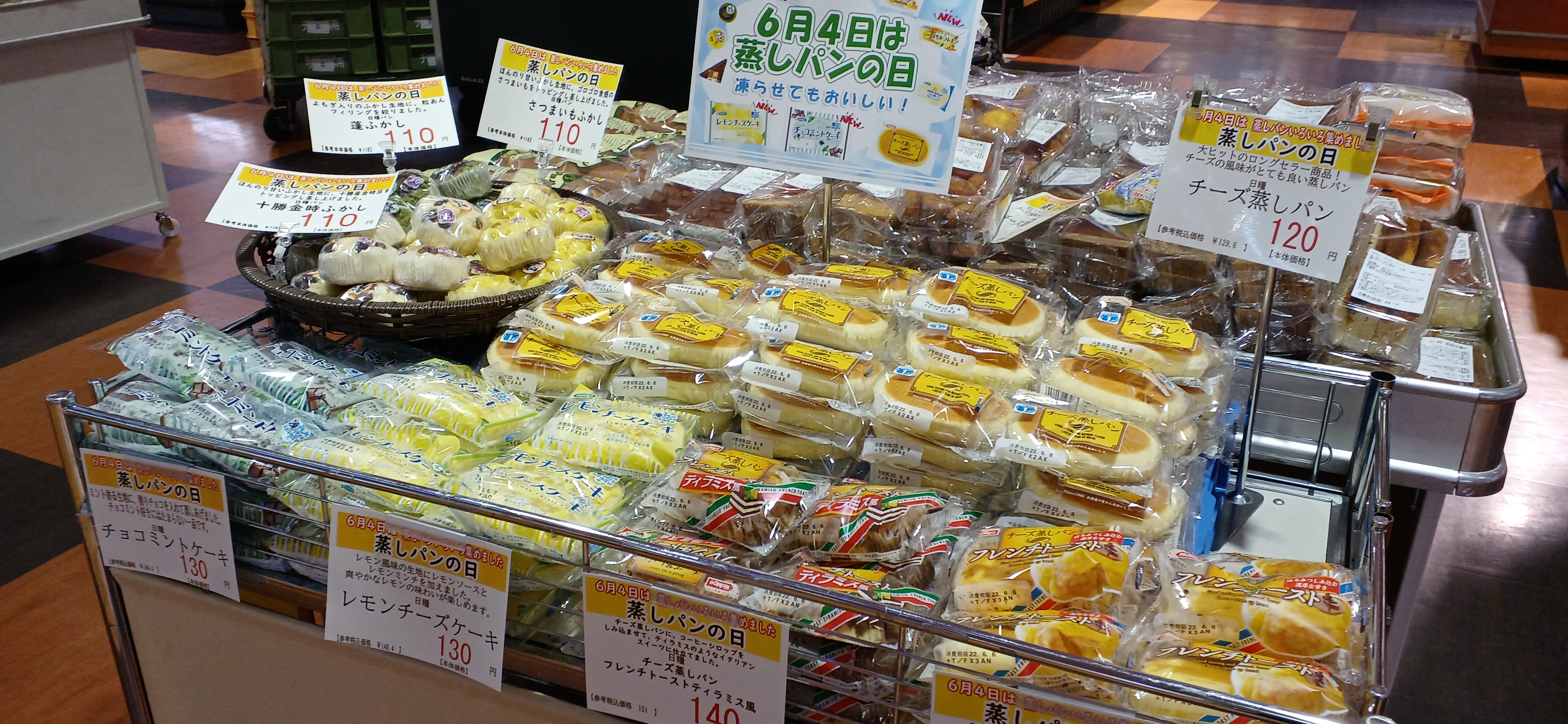 おはようございます。日配コーナーでは、蒸しパンの日として、日糧の蒸しパン各種販売しています。ぜひお買い求め下さい。