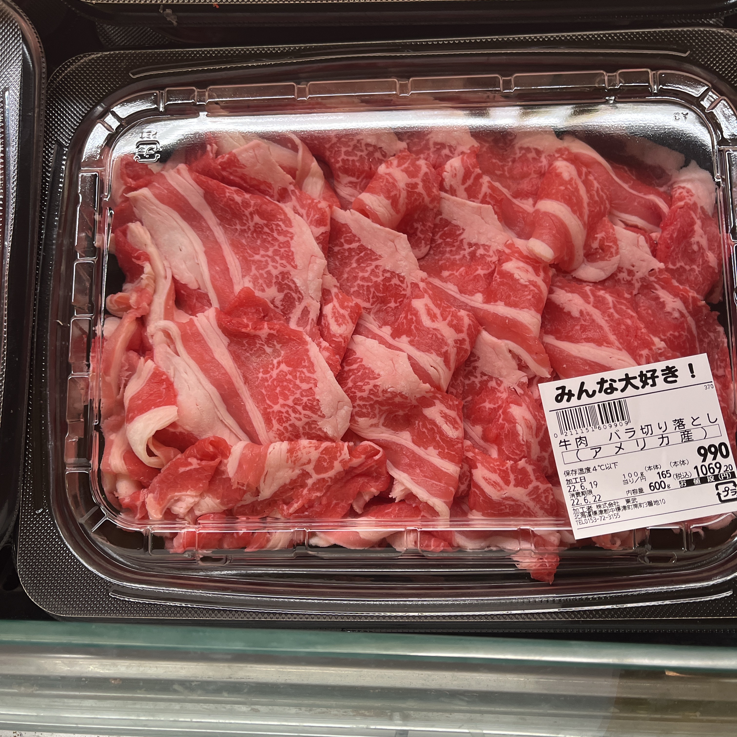 本日のミートコーナーからは、アメリカ産牛肉バラ切り落としが1パック600g990円にて販売中!炒め物など色々使える商品です。