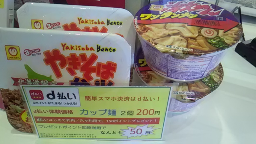 ただいま窓口では、スマホ決済「d払い」を初めて、または久しぶりのご利用をしていただくと、カップ麺をお得にGETできます!